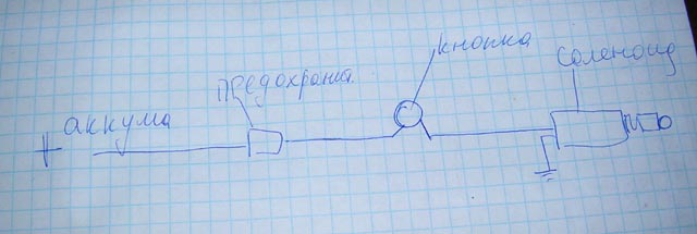 как никуда то,как тогда будет соленоид срабатывать если его плюсовй провод в никуда???чет не пойму