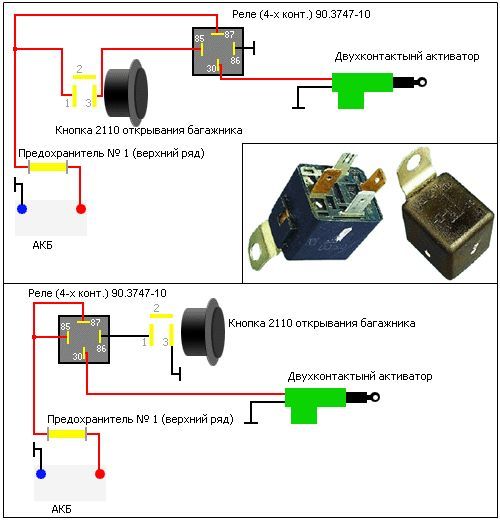Если использовать штатную кнопку открывания багажника от 2110, 2112 и т. д., то реле явно лишнее. Кнопка силовая и спокойно выдерживает ток потребляемый активатором. Так что все можно сделать проще.