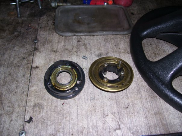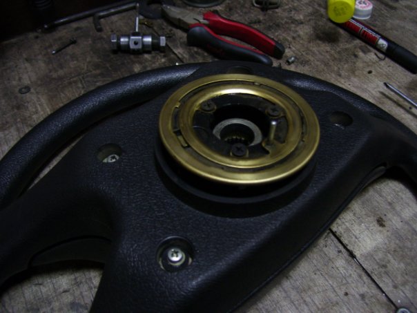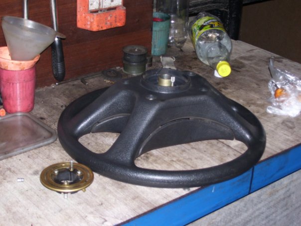Еще остался руль....покопался на работе в складе б/у з/ч - нашел кривой руль с 2110, открутил с него контактное кольцо, и прикрутил к родному вместо старого это кольцо на саморезы(длина самореза примерна 40мм=))) получил тем самым сигнал и возврат поворотников рулем)))