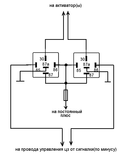 2. либо провода управления открытия дверей от сигналки перемотать на силовое управление активатором(висят на активаторе 2 минуса, а при открытии/закрытиии появляется плюс на соотв. проводе)