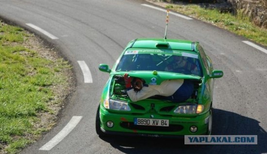 второй и третий кадр на ралли во франции случилась поломка и водитель осмотрел машину и понял, что поехать дальше они смогут только при условии, что кто-то будет держать поврежденный кабель он залез под капот а штурман за руль...))