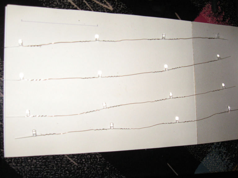 На листе, где я паял, начертил шаблон в 11 см. Между диодами медная жила. Раздербанивам какой-нибудь толстый провод и вперед! Удобно при пайке, так как жестко! Я припаявал диоды с точностью до мм, не торопитесь, и сделайте все ровно. Сейчас поймете зачем. Провода взял телефонные, сечение очень тонким, но для диодов достаточно! (Покупается 4-х или 8-ми жильный провод) Все припаеваем, проверяем! Фото 8.