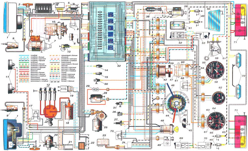 На 6-ти контактной колодке:Зеленый с красным, желтый с голубым, двойной черный, желтый с красным, эеленый, оранжевый с белым. Все это дело ухолдит в жгут.