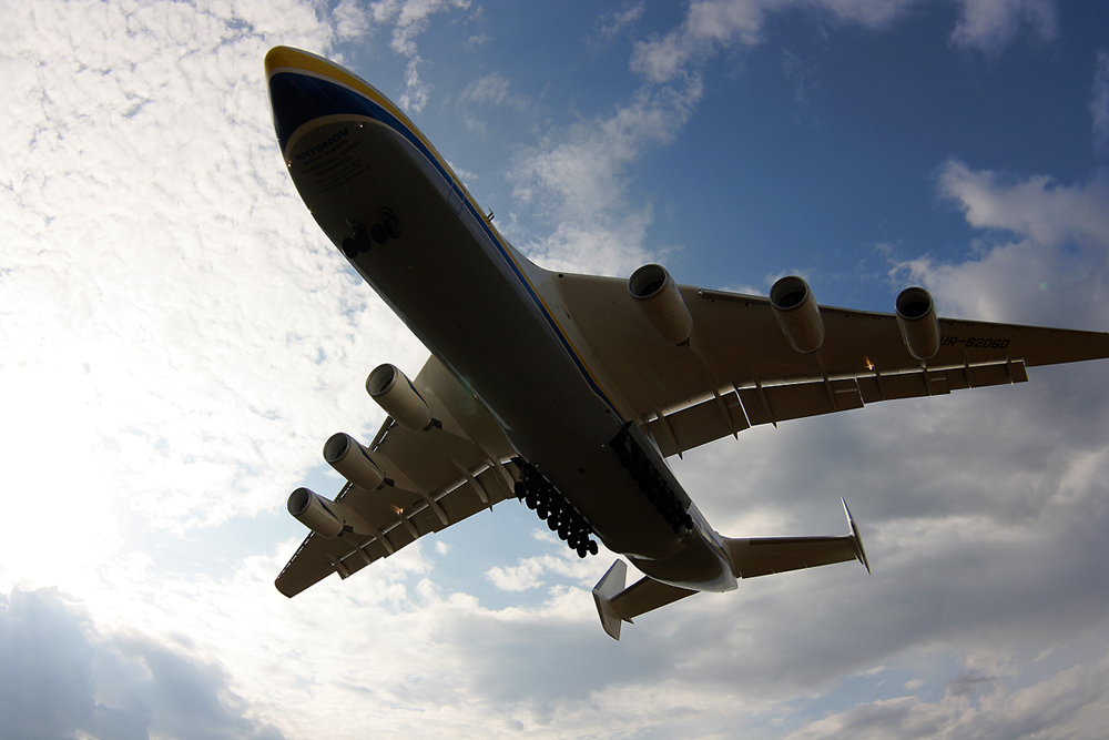на фото, где самолет пролетает над дорогой его младший брат АН-124 Руслан. это заметно по количеству двигателей на крыле, у АН 225 их по три с каждой стороны.