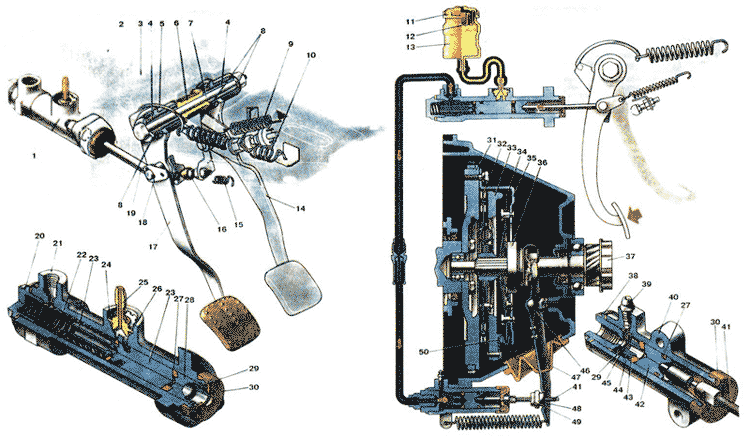 Выключение сцепления осуществляется через гидравлический привод с подвесной педалью. Этот тип привода обеспечивает плавное включение сцепления, что, в свою очередь, снижает динамические нагрузки на детали трансмиссии и повышает комфортабельность при вождении автомобиля, гидравлический привод надежен и долговечен, трудоемкость технического обслуживания его сведена до минимума привод включена сервопружина 10, значительно снижающая усилие выключения сцепления. Педали сцепления и тормоза подвешены к кронштейну 3 на одной оси 7. выполненной в виде 6олта. Под его головку установлена упорная шайба, а на его конец навертывается гайка с пружинной шайбой. В ступицах педалей остановлены наружные пластмассовые втулки 8, которые не требуют смазки в процессе эксплуатации автомобиля. Поворот педалей происходит на внутренних металлических втулках 4, надетых на ось. Между педалью тормоза и щекой кронштейна установлена дистанционная пластмассовая втулка. Педаль сцепления шарнирно соединена с толкателем 19 и пластиной 18 оттяжной пружины. Они удерживаются на пальце шплинтом. Оттяжная пружина 15 удерживает педаль сцепления в исходном положении, при котором педаль упирается в колпачок ограничителя 16 хода педали. Другой конец толкателя входит в гнездо поршня 28 главного цилиндра. Ограничителем хода педали можно регулировать зазор между полусферическим концом толкателя и поршнем 28. К верхнему концу педали приварен кронштейн, в вырез которого заходит крючок 5, другой конец крючка соединен с сервопружиной 10. Сервопружина стремится повернуть верхнюю часть педали в сторону выключения сцепления, чем значительно снижает усилие, прикладываемое к педали сцепления. Главный цилиндра привода выключения сцепления крепится на двух шпильках к торцевой пластине кронштейна педалей тормоза и сцепления. 6 полости главного цилиндра установлены возвратная пружина 22 и *рва поршня 23 и 28.Пружина опирается одним концом в пробку 20, другим в буртик поршня 23 и служит для возвращения поршней в исходное положение. За счет установки двух поршней уменьшаются радиальные нагрузки на поршень 23 при воздействии толкателя 19на поршень 28, а также улучшается уплотнение поршней, так как между ними сжимается уплотни- тельное кольцо 27. Поршень главного цилиндра уплотнен резиновым кольцом, которое расположено в канавке поршня и создает герметичность в рабочей полости цилиндра. Чтобы по мере возрастания давления в рабочей полости одновременно улучшалось уплотнение поршня, в его хвостовике выполнен осевой канал, соединяющийся с радиальными отверстиями, которые выходят в канавку уплотнительного кольца. Когда давление в рабочей полости цилиндра возрастает, то под его воздействием уплотни- тельное кольцо распирается по радиусу, т. е. плотнее прилегает к зеркалу цилиндра. Одновременно уплотнительное кольцо является клапаном, через который полость цилиндра сообщается с бачком 13. Это происходит при крайнем заднем положении поршней главного цилиндра, когда уплотнительное кольцо не перекрывает компенсационное отверстие. 6се детали главного цилиндра удерживаются в полости стопорным кольцом 29. Защитный колпачок 30 предохраняет полость цилиндра от загрязнения. В отверстиях корпуса цилиндра закреплены трубопровод, отводящий жидкость от главного цилиндра к рабочему, и штуцер 