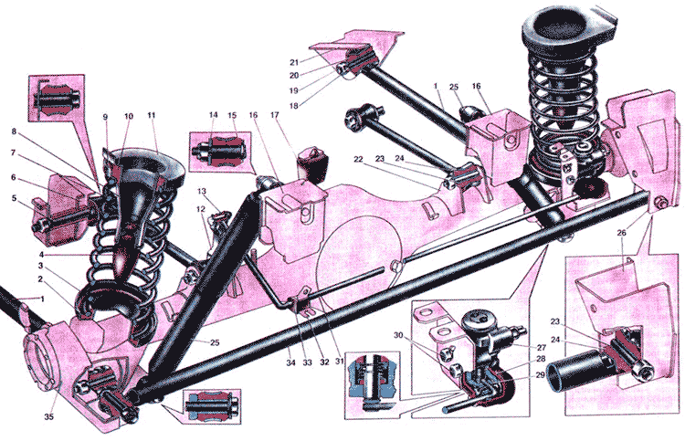1. Нижняя продольная штанга; 2. Нижняя изолирующая прокладка пружины подвески; 3. Нижняя опорная чашка пружины подвески; 4. Буфер хода сжатия; 5. Болт крепления верхней продольной штанги; 6. Кронштейн крепления верхней продольной штанги; 7. Пружина подвески; 8. Опора буфера хода сжатия; 9. Верхняя обойма прокладки пружины; 10. Верхняя изолирующая прокладка пружины; 11. Верхняя опорная чашка пружины подвески; 12. Стойка рычага привода регулятора давления; 13. Резиновая втулка рычага привода регулятора давления; 14. Шайба шпильки крепления амортизатора; 15. Резиновые втулки проушины амортизатора; 16. Кронштейн крепления заднего амортизатора; 17. Дополнительный буфер хода сжатия; 18. Шайба распорной втулки; 19. Распорная втулка нижней продольной штанги; 20. Резиновая втулка нижней продольной штанги; 21. Кронштейн крепления нижней продольной штанги; 22. Кронштейн крепления верхней продольной штанги к балке моста; 23. Распорная втулка поперечной и продольной штанг; 24. Резиновая втулка верхней продольной и поперечной штанг; 25. Задний амортизатор; 26. Кронштейн крепления поперечной штанги к кузову; 27. Регулятор давления тормозов; 28. Защитный чехол регулятора давления; 29. Ось рычага привода регулятора давления; 30. Болты крепления регулятора давления; 31. Рычаг привода регулятора давления; 32. Обойма опорной втулки рычага; 33. Опорная втулка; 34. Поперечная штанга; 35. Опорная пластина кронштейна крепления поперечной штанги.