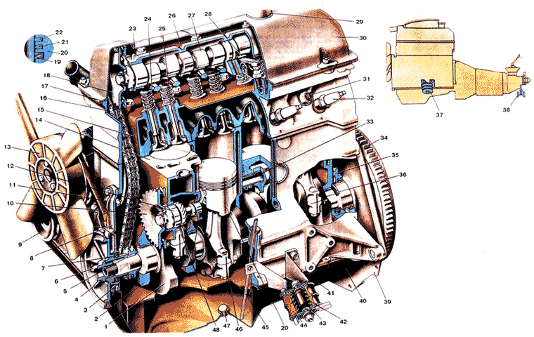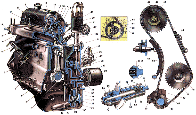 1. Коленчатый вал; 2. Крышка первого коренною подшипника; 3. Звездочка коленчатого вала; 4. Шкив коленчатого вала; 5. Шпонка шкива и звездочки коленчатого вала; 6. Храповик; 7. Передний сальник коленчатого вала; 8. Крышка привода механизма газораспределения; 9. Шкив генератора; 10. Звездочка привода масляного насоса, топливного насоса и распределителя зажигания; 11. Ремень привода вентилятора, насоса охлаждающей жидкости и генератора; 12. Валик привода масляного насоса, топливного насоса и распределителя зажигания; 13. Вентилятор системы охлаждения двигателя; 14. Блок цилиндров; 15. Головка цилиндров; 16. Цепь привода механизма газораспределения; 17. Прокладка крышки головки цилиндров; 18. Звездочка распределительного вала; 19. Маслосъемное кольцо; 20. Поршень; 21. Нижнее компрессионное кольцо; 22. Верхнее компрессионное кольцо; 23. Установочный выступ на корпусе подшипников распределительного вала; 24. Выпускной клапан; 25. Впускной клапан; 26. Корпус подшипников распределительного вала; 27. Распределительный вал; 28. Рычаг привода клапана; 29. Маслоналивная горловина крышки головки цилиндров; 30. Крышка головки цилиндров; 31. Датчик указателя температуры охлаждающей жидкости; 32. Свеча зажигания; 33. Палец поршня; 34. Маховик с зубчатым ободом в сборе; 35. Держатель заднего сальника коленчатого вала; 36. Упорное полукольцо коленчатого вала; 37. Передняя опора двигателя; 38. Задняя опора двигателя; 39. Передняя крышка картера сцепления; 40. Масляный картер; 41. Кронштейн передней опоры; 42. Пружина передней опоры; 43. Буфер подушки передней опоры; 44. Резиновая подушка передней опоры;