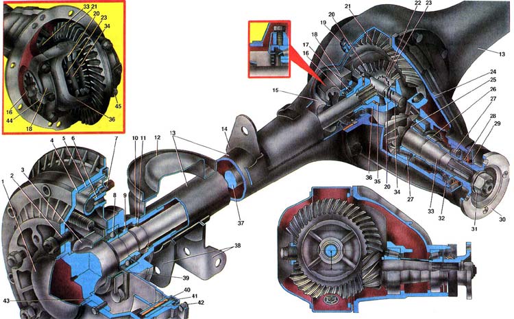 Крутящий момент на задние ведущие колеса передается через главную передачу и дифференциал, размещенные в заднем мосту автомобиля.