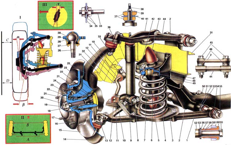 | Связывающим звеном между колесами и кузовом являются передняя и задняя подвески автомобиля. Через них передаются на кузов силы, действующие на колеса. В подвески включены элементы, которые смягчают передаваемые динамические нагрузки, уменьшают колебания кузова, обеспечивают хорошую устойчивость и плавность хода автомобиля. К этим элементам относятся направляющее устройство, упругие элементы, амортизаторы и стабилизатор поперечной устойчивости. Передняя подвеска независимая, бесшкворневая, со стабилизатором поперечной устойчивости. Тип и конструкция подвески обеспечивают плавность хода и устойчивость автомобиля при высокой скорости. Направляющее устройство подвески определяет характер движения колеса относительно дороги и кузова и передает силы и моменты от колеса к кузову. К этому устройству относятся верхний 41 и нижний 1 рычаги подвески и шарнирно связанный с ними поворотный кулак 25. Связывающим звеном подвесок правого и левого колес является поперечина 51 трубчатого сечения. К обоим концам поперечины приварены кронштейны 2, которыми подвеска крепится к лонжеронам кузова. В отверстиях бобышек кронштейна запрессованы втулки 52 осей нижних рычагов. Сзади к поперечине приварены два кронштейна для крепления растяжек 33. Другими концами растяжки крепятся к кронштейнам 34 кузова. Растяжки воспринимают продольные силы и их моменты во время движения автомобиля и этим самым предохраняют болты крепления поперечины от срезания. Нижний рычаг 1 подвески сварен из двух частей, которые, соединяясь, образуют гнездо для крепления нижнего шарового шарнира 13. Рычаг 1 соединяется с поперечиной 51 подвески осью 55 через резинометаллические шарниры 54. Резиновая втулка 57 шарнира установлена с большим радиальным натягом между наружной 59 и внутренней 58 втулками. Наружная втулка шарнира запрессована в отверстие рычага 1; через внутреннюю втулку 58 проходит ось 55. С торцов резиновая втулка шарнира зажата между упорными шайбами 56 и 60. При качании рычага подвески происходит деформация резиновой втулки без проворачивания ее относительно деталей шарнира. Между торцевыми поверхностями резинометаллических шарниров и втулками 52 оси поперечины установлены упорные шайбы 56 и набор технологических шайб 53 толщиной 0,5 мм. Изменением толщины набора шайб 53 регулируют продольный наклон оси поворота при сборке автомобиля на заводе. Верхний рычаг 41 подвески на наружной вилчатой части имеет посадочное гнездо для крепления верхнего шарового шарнира 36; в проушины рычага запрессованы резинометаллические шарниры, конструкция которых аналогична шарнирам нижних рычагов, но размер другой. Верхний рычаг в сборе с резинометаллическими шарнирами крепится двумя болтами к боковому кронштейну поперечины подвески. Шаровые опоры 36 и 13 соединяют рычаги подвески с поворотным кулаком 25. Шарниры неразборной конструкции, верхние и нижние одинаковой конструкции, взаимозаменяемы; в процессе эксплуатации автомобиля смазки не требуют. К упругим элементам подвески относятся пружины 4 и резиновые буфера отбоя и сжатия. Буфер отбоя 43 грибовидным хвостовиком удерживается в кронштейне 42. Буфер сжатия 5 удерживается хвостовиком в обойме, соединенной контактной сваркой со стойкой 6. При статической нагрузке нижняя опорная чашка 3 слегка упирается в буфер сжатия 5, что о