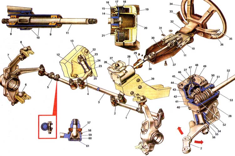 1. Боковая тяга; 2. Сошка; 3. Средняя тяга; 4. Маятниковый рычаг; 5. Регулировочная муфта: 6. Нижний шаровой шарнир подвески; 7. Поворотный кулак; 8. Верхний шаровой шарнир подвески; 9. Подшипник верхнего вала рулевого управления; 10. Кронштейн крепления вала рулевого управления; 11. Верхний вал рулевого управления; 12. Кронштейн маятникового рычага; 13. Правый лонжерон кузова; 14. Нижнее контактное кольцо: 15. Держатель нижнего контактного кольца; 16. Держатель включателя сигнала; 17. Верхнее контактное кольцо; 18. Пружина включателя сигнала: 19. Включатель звукового сигнала; 20. Облицовка крышки включателя сигнала; 21. Провод; 22. Верхняя шайба; 23. Уплотнитель; 24. Втулка оси маятникового рычага; 25. Нижняя шайба; 26. Пробка маслоналивного отверстия; 27. Защитный колпачок; 28. Картер рулевого механизма; 29. Уплотнитель вала рулевого управления; 30. Промежуточный вал рулевого управления: 31. фиксирующая пластина передка кузова; 32. Верхняя часть облицовочного кожуха; 33. Рычаг переключателя стеклоочистителя и смывателя: 34. Рулевое колесо: 35. Рычаг переключателя указателей поворота; 36. Рычаг переключателя света фар; 37. Нижняя часть облицовочного кожуха; 38. Стяжной болт вилки карданного шарнира: 39. Левый лонжерон пола кузова; 40. Нижняя крышка картера рулевого механизма; 41. Регулировочные прокладки; 42. Ось ролика вала сошки; 43. Упорная шайба ролика; 44. Ролик; 45. Пластина регулировочного винта; 46. Стопорная шайба; 47. Регулировочный винт; 48. Контргайка: 49. Верхняя крышка картера рулевого механизма: 50. Червяк; 51. Подшипник червяка; 52. Вал червяка; 53. Сальник вала червяка; 54. Втулка вала сошки: 55. Сальник вала сошки; 56. Вал сошки; 57. Защитный чехол шарового пальца; 58. Вкладыш шарового пальца; 59. Шаровой палец: 60. Пружина вкладыша: 61. Заглушка.