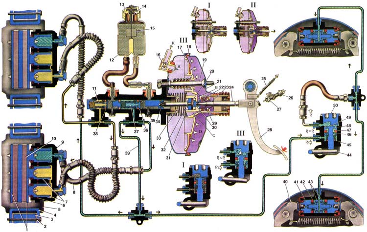 1. Система расторможена. Педаль 28 тормоза оттянута пружиной 25 в исходное положение до упора в наконечник 27 выключателя стоп-сигнала. Толкатель 24 с поршнем 30, а также корпус 17 клапана со штоком 32 под действием пружины 31 занимают крайнее заднее положение. Клапан 22 пружиной 29 прижат к заднему торцу поршня 30. Доступ атмосферного воздуха в полость D перекрыт, а полость А через канал В, щель между клапаном 22 и торцом корпуса 17 и канал С свободно соединяется с полостью D. При работающем двигателе разрежение из впускной трубы двигателя через шланг К передается в полость А и затем через канал В в полость D. Поршни 37 главного цилиндра под действием возвратных пружин занимают крайнее заднее положение до упора в ограничители 35. В этом положении между поршнем 37 и штоком 32 усилителя имеется зазор 1,05-1,25 мм; распорные втулки 36, упираясь в ограничительные винты 35, отжимают уплотнители 38 в переднее положение, тем самым открывая проходы для тормозной жидкости. Рабочие полости главного тормозного цилиндра свободно сообщаются с полостями бачка 12 через шланги, через отверстия в цилиндре, через лабиринты между поршнями 11 и 37, распарными втулками 36 и уплотнителями 38 и далее через радиальные и осевые отверстия в поршнях. Поршни колесных цилиндров передних тормозов отжаты от тормозных колодок примерно на 0,1 мм за счет упругой деформации уплотнительных колец, и тормозные колодки находятся в легком соприкосновении с рабочими поверхностями тормозного диска. Тормозные колодки 40 задних тормозов под действием стяжных пружин отведены от тормозного барабана, а поршни 41 колесных цилиндров вдвинуты внутрь цилиндров до упора сухарей в буртик упорных колец 43. При движении автомобиля без торможения поршень 49 регулятора давления за счет предварительного скручивания торсионного рычага поднят в крайнее верхнее положение до упора головки поршня в пробку 50 регулятора. В этом положении поршня тормозная жидкость свободно проходит к колесным цилиндрам задних тормозов через зазоры между поршнем 49, уплотнителем 47 и втулкой 48. И. Начало торможения. При торможении нажатием на тормозную педаль толкатель 24 клапана переместится вместе с поршнем 30. Под действием пружины 29 клапан 22 закроет кольцевую щель и разобщит вакуумную полость А с атмосферной полостью D. Поршень 30 переместится вперед до упора в пластину, и между задним торцом поршня и клапана 22 появится зазор, который соединит атмосферную полость D с наружным воздухом. Заполняя вакуум, наружный воздух через фильтр и образовавшийся зазор между поршнем и клапаном поступит в полость О и создаст давление на диафрагму 18. Под действием разности давления в полостях А и D корпус 17 клапана через буфер 20 будет давить на шток 32, снижая тем самым усилие на тормозной педали. Первоначально выбирается зазор между поршнем 37 и регулировочным болтом штока, затем начнет перемещаться поршень 37 полости привода вторичного контура. Как только распорная втулка 36 отойдет от ограничительного винта 35, уплотнительное кольцо 38 под действием пружины прижмется к торцевой поверхности кольцевой канавки поршня и разобщит полость привода первичного контура и полость бачка 12. С этого момента при дальнейшем перемещении поршня 37 будет создаваться давление тормозной жидкости в полости первичного контура, которое вызовет перемещение поршня полости пр