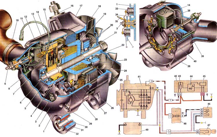 На автомобилях ВАЗ-21213 применяется трехфазный генератор переменного тока типа 37.3701 со встроенным выпрямительным блоком и микроэлектронным регулятором напряжения. Он служит для питания потребителей автомобиля электрическим током и для зарядки аккумуляторной батареи. Максимальная сила тока отдачи генератора (при 13 В и 5000 об/мин) составляет 55 А, а пределы регулируемого напряжения 14,1+0,5 В. Основные части генератора это ротор, статор 25, крышка 1 с выпрямительным блоком 28, крышка 17 с подшипником 22, шкив с вентилятором 18 и щеткодержатель с регулятором напряжения 14. Крышки и статор стянуты в единое целое четырьмя стяжными болтами, 29. Для предохранения внутренних полостей генератора от грязи крышка 1 закрыта защитным кожухом 2. Воздух для охлаждения генератора берется из верхней зоны моторного отсека и по воздухозаборнику 10 подается к патрубку защитного кожуха. Ротор представляет собой вращающийся электромагнит. Стальные клювообразные полюсные наконечники 19 и 27 и втулка 23, напрессованные на вал ротора, образуют сердечник электромагнита. Между полюсными наконечниками в пластмассовом каркасе находится обмотка 24 ротора, называемая обмоткой возбуждения. Ток в обмотку подводится через медные контактные кольца 4, к которым припаяны выводы обмотки. Вал ротора вращается в двух шариковых подшипниках 5 и 22, установленных в крышках 1 и 17. Подшипники закрытого типа. Смазки, заложенной в них при изготовлении, достаточно на весь срок службы генератора. Внутренняя обойма переднего подшипника 22 свободно посажена на вал ротора и вместе с дистанционным кольцом 21 зажата между ступицей шкива и буртиком вала гайкой крепления шкива. Наружная обойма этого подшипника запрессована в крышку 17 и зажата между двумя шайбами, стянутыми четырьмя винтами. Концы винтов раскернены. Внутренняя обойма заднего подшипника 5 напрессована на вал ротора, а его наружная обойма поджимается резиновым кольцом, помещенным в канавку крышки. Статор генератора состоит из сердечника с обмоткой 26. Сердечник набран из пластин электротехнической стали, соединенных в четырех местах электросваркой. В пазах сердечника уложена трехфазная обмотка статора, концы которой соединены в звезду без вывода нулевой точки. Выпрямитель, преобразующий переменный ток генератора в постоянный, выполнен в виде выпрямительного блока 28. Он представляет собой два алюминиевых держателя с запрессованными в них шестью диодами типа ВА-20 - полупроводниковыми приборами, пропускающими ток только в одном направлении. Для упрощения конструкции выпрямителя применены диоды разной полярности "положительные" и "отрицательные". У положительных диодов на корпусе создается "плюс" выпрямленного напряжения, а у отрицательных "минус". Положительные диоды запрессованы в держатель 37 выпрямительного блока, а отрицательные - в держатель 34. Выпрямительный блок крепится к крышке 1 тремя болтами 3, изолированными вместе с держателем положительных диодов от крышки пластмассовыми втулками. Гайками этих болтов одновременно зажимаются выводы диодов и обмотки статора. К держателю 37 присоединен зажим "30" генератора (болт 9), являющийся выводом "плюс" выпрямителя. Выводом "минус" является масса генератора. На держателе 37 выпрямительного блока установлены также и три дополнительных диода 40. Напряжение, снимаемое с этих диодо