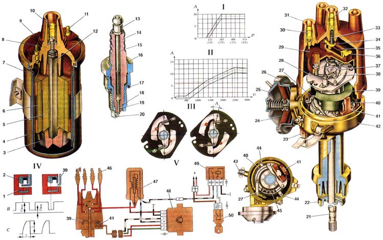 На автомобилях ВАЗ-21213 применяется бесконтактная электронная система зажигания высокой энергии. Она состоит из следующих основных узлов: датчика-распределителя зажигания, коммутатора, свечей зажигания, катушки зажигания, выключателя зажигания и проводов высокого напряжения. Датчик-распределитель зажигания применяется типа 3810.3706 и служит для выдачи управляющих импульсов низкого напряжения на коммутатор и для распределения импульсов высокого напряжения по свечам зажигания. Он установлен в левой передней части двигателя и приводится во вращение от винтовой зубчатой шестерни 21 (см. рис. 3). Валик 21 вращается в металлокерамической втулке, запрессованной в корпусе 42. Смазка к втулке подводится по фитилю от масленки 43. На валике расположены детали центробежного регулятора зажигания: ведущая пластина 37 и опорная пластина 28 с грузиками 38. Ведущая пластина закреплена на валике, а опорная - вместе с экраном 39 составляет единый узел с втулкой, надетой на валик. Втулка в небольших пределах может поворачиваться на валике. Бесконтактный датчик 41 закреплен на пластине 40 и действует на основе эффекта Холла, который заключается в возникновении поперечного электрического поля в пластинке полупроводника при действии на нее магнитного поля. Датчик состоит из полупроводниковой пластинки 1 с интегральной микросхемой и постоянного магнита 2 с магнитопроводом. Между пластинкой и магнитом имеется зазор, в котором находится стальной экран 39 с четырьмя прорезями. Когда через зазор датчика проходит тело экрана (см. схему IV), то магнитные силовые линии замыкаются через экран и на пластинку не действуют. Поэтому разность потенциалов в пластинке не возникает. Если же в зазоре находится прорезь экрана, то на пластинку полупроводника действует магнитное поле, и с нее снимается разность потенциалов. Интегральная микросхема, встроенная в датчик. преобразует разность потенциалов, возникающую на пластинке, в импульсы напряжения отрицательной полярности. Таким образом, когда тело экрана находится а зазоре датчика, то на его выходе имеется напряжение, примерно на 3 В меньшее напряжения питания. Если же через зазор датчика проходит прорезь экрана, то напряжение на выходе датчика близко к нулю (им более 0,4 В). Коммутатор. Электронный коммутатор 48 служит для прерывания тока в первичной цепи катушки зажигания по сигналам бесконтактного датчика. Могут применяться взаимозаменяемые коммутаторы различных марок: 3620.3734, HIM-52. ВАТ10.2, НТ1903 или PZE4020. Для прерывания тока служит специальный мощный высоковольтный транзистор. В схеме коммутатора имеется устройство для автоматического регулирования периода 1 накопления тока 1 в катушке зажигания в зависимости от частоты вращения коленчатого вала. Величина импульсов тока 1 составляет 8-9 А. Кроме того, предусмотрено автоматическое отключение тока через катушку зажигания при неработающем двигателе, но включенном зажигании. Через 2-5 сек после остановки двигателя выходной транзистор запирается, не создавая при этом искры на свечах зажигания. Свечи зажигания применяются либо отечественные типа А-17ДВ-10 или FE65PR производства Словении, или им подобные. Эти свечи имеют встроенный помехоподавительный резистор величиной 4-10 ком. Конструкция свечей традиционная. Зазор между электродами свечей составляет 0,7-0,8 мм. Выключатель з