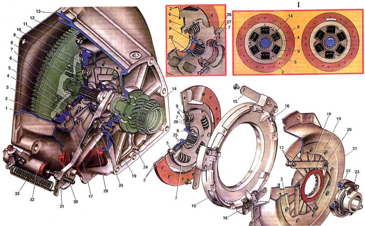 На автомобиле ВАЗ-21213 применяется сухое, одно - дисковое сцепление с демпфером (гасителем крутильных колебаний) и центральной диафрагмойной нажимной пружиной. Сцепление предназначено: для временного разъединения трансмиссии и двигателя при включении, переключении и выключении передач; для плавного соединения трансмиссии и двигателя в начале движения автомобиля и при переключении передач. Сцепление состоит из двух основных частей: ведомой и ведущей. К ведомой части сцепления относится ведомый диск 4 в сборе с фрикционными накладками 2 и демпфером (гасителем крутильных колебаний). К ведущей части сцепления относится нажимной диск 10 в сборе с кожухом 12, диафрагменной нажимной пружиной 1 и упорным фланцем 21. Ведомая и ведущая части сцепления вместе с маховиком 11 размещены внутри алюминиевого картера 13. Картер сцепления передним торцам крепится на болтах к заднему торцу блока цилиндров и между ними установлена штампованная крышка картера сцепления. К заднему торцу картера сцепления крепится на шпильках картер коробки передач. Ведомый диск сцепления состоит из диска 4 и ступицы 8, которая перемещается по шлицам первичного вала 14 коробки передач. Ведомый диск 4 выполнен из стали и имеет прорези, которые делят его на девять лепестков. Каждая фрикционная накладка 2 приклепана к лепесткам ведомого диска девятью заклепками. Заклепки, удерживающие свою накладку, утопают в ней головками, а стержни заклепок расклепаны со стороны ведомого диска в специальных отверстиях противоположной накладки. При включенном сцеплении ведомый диск 4 зажат между маховиком 11 и нажимным диском 10 диафрагменной нажимной пружиной 1 и крутящий момент от маховика И передается на фрикционные накладки 2, далее через демпфер (гаситель крутильных колебаний) к ступице 8 ведомого диска. Демпфер служит для снижения крутильных колебаний коленвала при передаче крутящего момента на коробку передач и для уменьшения пиковых напряжений в элементах трансмиссии, возникающих при резком изменении скоростного режима. Демпфер состоит из упругой муфты с шестью пружинами 9 и фрикционного элемента. Последний состоит из двух фрикционных колец 25, между поверхностями которых зажат фланец ступицы 8 и кольцевой пружинной шайбы 27, которая опирается на кольцо 26, сжимая фрикционные кольца 25 для обеспечения необходимого момента трения. Фрикционный элемент демпфера имеет определенный момент трения, в результате которого исключаются резонансные колебания и часть поглощаемой энергии крутильных колебаний превращается в тепловую. Демпферные пружины 9 имеют неодинаковую жесткость трех типов и попарно расположены друг против друга. Установка пружин разных типов жесткости расширяет характеристику демпфера, как поглотителя крутильных колебаний, увеличивает рабочую зону действия демпфера. Фланец ступицы 8 имеет шесть прямоугольных окон для установки предварительно сжатых пружин 9 демпфера и три размещенных по окружности П-образных выреза для прохода заклепок-упоров 5 демпфера. Заклепки-упоры 5 соединяют диск 4 с передней 6 и задней 7 пластинами демпфера и являются ограничителями действия упругого элемента демпфера. При изменении передаваемого крутящего момента происходят угловые перемещения ведомого диска относительно его ступицы; направления этих перемещений взаимно противо