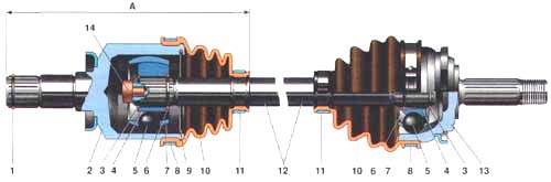Шарнир состоит из корпуса 2, 13, сепаратора 7, обоймы 4 и шести шариков 5, которые размещены в канавках корпуса и обоймы, В наружном шарнире эти канавки выполнены по радиусу, что обеспечивает угол его поворота до 42°. В корпусе внутреннего шарнира канавки прямые, что позволяет деталям перемещаться в продольном направлении, "удлиняя" или "укорачивая" привод (это необходимо для компенсации взаимных перемещений подвески и силового агрегата). Внутри обоймы имеется шлицевое отверстие для соединения с валом привода.