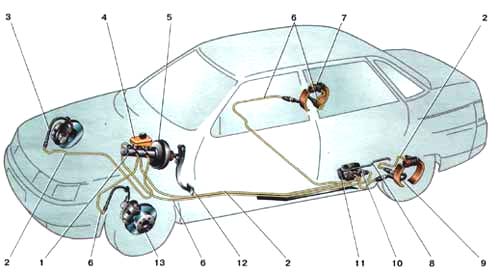Тормозные механизмы передних колес 13 - дисковые (на автомобилях ВАЗ-21103, -21113 и -2112 -вентилируемые), с однопоршневой плавающей скобой и сигнализатором износа тормозных накладок. Тормозные механизмы задних колес 7 - барабанные, с двухпоршневыми колесными цилиндрами и автоматической регулировкой зазора между колодками и барабаном. Устройство автоматической регулировки зазора расположено в колесном цилиндре.