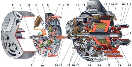 В статоре генератора расположена трехфазная обмотка, выполненная по схеме "звезда" (выводы фазных обмоток имеют общую точку). Вторые концы фазных обмоток соединены с выпрямительным мостом, состоящим из шести кремниевых диодов (вентилей) - трех "положительных" и трех "отрицательных". Вентили запрессованы в две подковообразные алюминиевые пластины-держатели в соответствии с полярностью (положительные и отрицательные - на разных пластинах); на одной из пластин также находятся три дополнительных диода, через которые питается обмотка возбуждения генератора после пуска двигателя. Пластины объединены в выпрямительный блок, закрепленный на задней крышке генератора (под пластмассовым кожухом).
