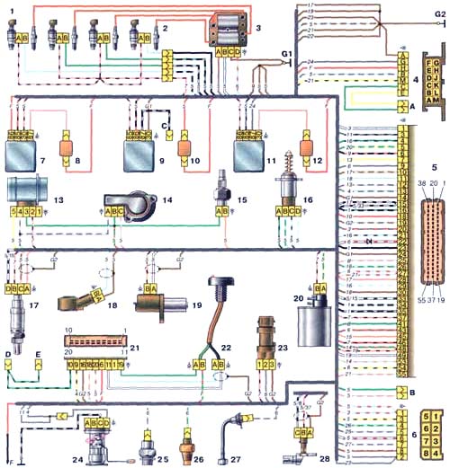 1. форсунки; 2. свечи зажигания; 3. модуль зажигания; 4. колодка диагностики; 5. контроллер, защищающий цепи главного реле; 6. колодка, присоединенная к жгуту проводов панели приборов; 7. главное реле; 8. предохранитель, защищающий цепи главного реле; 9. реле электровентилятора; 10. предохранитель, защищающий цепи реле электровентилятора; 11. реле электробензонасоса; 12. предохранитель, защищающий цепи реле электробензонасоса; 13. датчик массового расхода воздуха; 14. датчик положения дроссельной заслонки; 15. датчик температуры охлаждающей жидкости; 16. регулятор холостого хода; 17. датчик кислорода; 18. датчик детонации; 19. датчик положения коленчатого вала; 20. электромагнитный клапан продувки адсорбера; 21. блок управления автомобильной противоугонной системы (АПС); 22. индикатор состояния АПС; 23. датчик скорости автомобиля; 24. электробензонасос с датчиком уровня топлива; 25. датчик контрольной лампы давления масла; 26. датчик указателя температуры охлаждающей жидкости; 27. датчик уровня масла; 28. датчик фаз (устанавливается на автомобиле с 16-клапанным двигателем]; А. колодка, присоединяемая к жгуту салонной группы антиблокировочной системы тормозов (АБС); В. колодка, присоединяемая к жгуту проводов кондиционера; С. колодка, присоединяемая к жгуту проводов электровентилятора; D. провода, присоединяемые к выключателю зажигания (лампа подсветки); E. колодка, подключаемая к голубым проводам с белой полоской, отсоединенным от выключателя зажигания; F. к клемме"+" аккумуляторной батареи; G1, G2. точки заземления. Наряду с буквенный обозначением цвета проводов на данной схеме применяется обозначение номера элемента схемы, к которому присоединяется данный провод, например "-4-". В некоторых случаях кроме обозначения номера элемента приводится через косую дробь и номер контакта, например "-5/15-". На схеме не показаны точки соединения розово-черных, красных и зеленого с красной полоской проводов. |