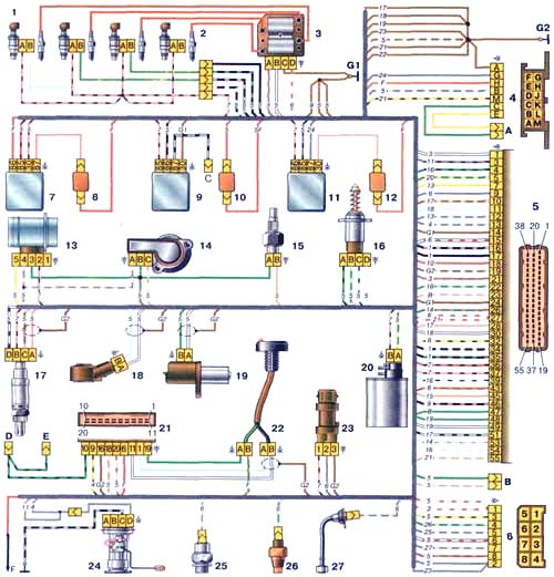 1. форсунки; 2. свечи зажигания; 3. модуль зажигания; 4. колодка диагностики; 5. контроллер; 6. колодка, присоединяемая к жгуту проводов панели приборов; 7. главное реле; 8. предохранитель, защищающий цепи главного реле; 9. реле электровентилятора; 10. предохранитель, защищающий цепи реле электровентилятора; 11. реле электробензонасоса; 12. предохранитель, защищающий цепи реле электробензонасоса; 13. датчик массового расхода воздуха; 14. датчик положения дроссельной заслонки; 15. датчик температуры охлаждающей жидкости; 16. регулятор холостого хода; 17. датчик кислорода; 18. датчик детонации; 19. датчик положения коленчатого вала; 20. электромагнитный клапан продувки адсорбера; 21. блок управления автомобильной противоугонной системы (АПС); 22. индикатор состояния АПС; 23. датчик скорости автомобиля; 24. электробензонасос с датчиком уровня топлива; 25. датчик контрольной лампы давления масла; 26. датчик указателя температуры охлаждающей жидкости; 27. датчик уровня масла; А. колодка, присоединяемая к жгуту салонной группы антиблокировочной системы тормозов (АБС); В. колодка, присоединяемая к жгуту проводов кондиционера; С. колодка, присоединяемая к жгуту проводов электровентилятора; D. провода, присоединяемые к выключателю зажигания (лампа подсветки); E. колодка, подключаемая к голубым проводам с белой полоской, отсоединенным от выключателя зажигания; F. к клемме "+" аккумуляторной батареи; G1, 02. точки заземления. Наряду с буквенным обозначением цвета проводов на данной схеме применяется обозначение номера элемента схемы, к которому присоединяется данный провод, например "-5-". На схеме не показаны точки соединения розово-черных, красных и зеленого с красной полоской проводов. |