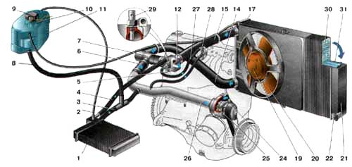 1. радиатор отопителя; 2. пароотводящий шланг радиатора отопителя; 3. шланг отводящий; 4. шланг подводящий; 5. датчик температуры охлаждающей жидкости (в головке блока); 6. шланг подводящей трубы насоса; 7. термостат; 8. заправочный шланг; 9. пробка расширительного бачка; 10. датчик указателя уровня охлаждающей жидкости; 11. расширительный бачок; 12. выпускной патрубок; 13. жидкостная камера пускового устройства карбюратора; 14. отводящий шланг радиатора; 15. подводящий шланг радиатора; 16. пароотводящий шланг радиатора; 17. левый бачок радиатора; 18. датчик включения электровентилятора; 19. электродвигатель вентилятора; 20. крыльчатка электровентилятора; 21. правый бачок радиатора; 22. сливная пробка; 23. кожух электровентилятора; 24. зубчатый ремень привода механизма газораспределения; 25. крыльчатка насоса охлаждающей жидкости; 26. подводящая труба насоса охлаждающей жидкости; 27. шланг подвода охлаждающей жидкости к дроссельному патрубку; 28. шланг отвода охлаждающей жидкости от дроссельного патрубка; 29. датчик температуры охлаждающей жидкости в выпускном патрубке; 30. трубки радиатора; 31. сердцевина радиатора.