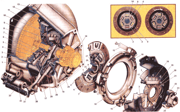 Сцепление обеспечивает плавное трогание автомобиля с места и бесшумное переключение передач. Принцип его действия основан на передаче крутящего момента от маховика на первичный вал коробки передач за счет сил трений, которые возникают между поверхностями маховика 11, ведомого 4 и нажимного 10 дисков при их сжатии. Ведомый диск расположен на шлицах первичного вала коробки передач, зажимается между маховиком и нажимным диском усилием пружины 1. А нажимной диск 10 вместе с кожухом 12 крепятся болтами к маховику. Таким образом, одни детали имеют постоянную связь с маховиком, другие временную. за счет сил трения, когда сцепление включено. Первые детали составляют ведущую часть сцепления, вторые - ведомую. Отвод нажимного диска от ведомого, т. е. выключение сцепления, осуществляется через гидравлический привод. Ведущая часть сцепления выполнена неразъемным узлом, в который входят кожух 12 сцепления, нажимный диск 10, центральная нажимная пружина 1 и детали, соединяющие их. Этот узел крепится к маховику шестью болтами и тремя установочными штифтами Кожух сцепления имеет вогнутую форму, образующую полость, для размещения нажимной пружины и нажимного диска. Внутри кожуха приварено одно опорное кольцо 17, на которое опирается одна сторона нажимной пружины. К кожуху заклепками 3 крепится нажимная пружина 1. Заклепки проходят через овальные отверстия нажимной пружины. В головки этих заклепок упирается другое опорное кольцо 17. Такое шарнирное соединение позволяет Пружине прогибаться относительно опорных колец. Нажимная пружина отштампована из пружинной стали. Радиальные прорези делят ее поверхность на отдельные лепестки, которые работают как рычаги выключения сцепления. На эти лепестки воздействует упорный фланец 21, который поджат к ним за счет упругости соединительных пластин 18. К наружной поверхности упорного фланца приклеено фрикционное кольцо 19. Наружная кромка нажимной пружины заходит в пазы фиксаторов 16, приклепанных к нажимному диску. Через фиксаторы при прогибе нажимной пружины относительно опорных колец 17 происходит отвод нажимного диска от ведомого. Нажимный диск 10 - чугунный. Имеет форму кольца с тремя приливами. С кожухом сцепления он соединен тремя парами упругих пластин 15, которые приклепаны одним концом к приливам нажимного диска, другим - к кожуху сцепления. Такая связь обеспечивает передачу крутящего момента от кожуха 12 на нажимный диск и одновременно осевое перемещение нажимного диска внутри кожуха сцепления. Ведомая часть сцепления состоит из ведомого диска 4 с фрикционными накладками 2 и гасителя крутильных колебаний (демпфера). Диск стальной, Т-образные радиальные прорези делят его на двенадцать лепестков. На каждом лепестке имеется плоский участок и два гиба (выпуклости), за счет которых поверхность диска имеет волнообразную форму. Чтобы эта форма сохранилась, фрикционные накладки 2 приклепаны к каждому лепестку независимо друг от друга, одна к выпуклой части лепестка, другая - к плоской головки заклепок утопают в отверстиях накладок, а их стержни расклепаны со стороны диска через отверстия в противоположной накладке. Ведомый диск соединен со ступицей 8 не жестко, а эластично через детали демпфера. Такая упругая связь обеспечивает гашение крутильных колебаний, которые возникают в трансмиссии вследствие н