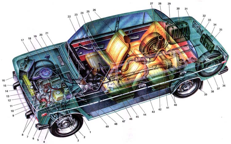Автомобили семейства ВАЗ-2103 и ВАЗ-2106 являются моделями последовательного развития конструкции малолитражных автомобилей "Жигули". Их отличают хорошие динамические качества и комфортабельность. Вместе с тем, для наиболее полного удовлетворения запросов покупателей на основе базовых моделей ВАЗ-2103 и ВАЗ-2106 завод выпускает модификации автомобилей, которые отличаются, в основном, установкой двигателей с другим рабочим объемом цилиндров. Компоновка (расположение узлов и агрегатов) автомобилей ВАЗ-2103 и ВАЗ-2106 классическая, т.е. двигатель расположен спереди вдоль осевой линии автомобиля, а ведущими являются задние колеса. Крутящий момент от двигателя передается к задним колесам через узлы трансмиссии, к которой относятся сцепление, коробка передач, карданная передача, главная передача, дифференциал и полуоси заднего моста. Двигатель вместе со сцеплением и коробкой передач образует силовой агрегат, который закреплен на автомобиле в трех точках на резиновых опорах. В конструкции автомобилей учтены требования активной и пассивной безопасности, которым на Волжском автозаводе всегда уделялось большое внимание. Автомобили отвечают всем требованиям по безопасности Европейской Экономической комиссии ООН. Двигатель. На автомобилях устанавливаются унифицированные двигатели ВАЗ различной мощности в зависимости от модели автомобиля или ее модификации. Двигатели - четырехтактные, карбюраторные, рядные, с верхним расположением распределительного вала. Система смазки двигателя снабжена полнопоточным масляным фильтром 10 и рассчитана на применение специальных масел с комплексом присадок, придающих маслу высокие смазочные свойства, стойкость против окисления и позволяющих работать в широком диапазоне температур. Система вентиляции картера - закрытого типа, обеспечивает отсос газов из картера во впускной трубопровод и повышает долговечность двигателя. Система охлаждения - жидкостная, закрытого типа. В систему охлаждения двигателя включен отопитель кузова, в который жидкость поступает из головки цилиндров через кран и отводится к насосу. Охлаждающая жидкость специальная с низкой температурой кипения, не действует на металлы и резину. Жидкость заливают на заводе, и не требуется ее замены в течение двух лет. Система питания двигателя включает воздушный фильтр 17, карбюратор, топливный насос 11 с рычагом ручной подкачки топлива и топливный бак. Карбюратор с падающим потоком имеет две последовательно включающиеся смесительные камеры. На карбюраторе установлен высокоэффективный воздушный фильтр сухого типа, имеющий бумажный фильтрующий элемент с дополнительным очистителем из нетканого синтетического волокна. Топливный бак 20 размещен в багажнике. Система выпуска газов снабжена тремя последовательно расположенными глушителями. Соединенные хомутами узлы системы крепятся к полу кузова двумя резиновыми ремнями на корпус основного глушителя и резиновой подушкой за выпускную трубу. Трансмиссия. Сцепление - однодисковое сухое с диафрагменной нажимной пружиной и гасителем крутильных колебаний (демпфером) на ведомом диске. Для управления сцеплением служит ножная педаль с сервопружиной и гидравлическим приводом. Коробка передач 46 имеет четыре передачи для движения вперед и одну передачу для заднего хода. На автомобилях в ва