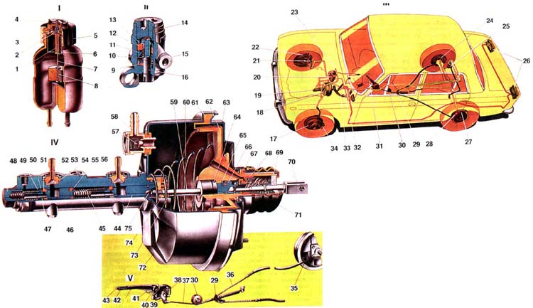 Гидравлический привод включает в себя тормозную педаль 33. вакуумный усилитель 18, главный цилиндр 19. бачок 20, регулятор 25 давления задних тормозов, колесные цилиндры тормозных механизмов, трубопроводы и шланги. Вакуумный усилитель уменьшает усилие, прикладываемое к педали тормоза при торможении. Между корпусом 72 и крышкой 63 вакуумного усилителя зажат, наружный поясок резиновой диафрагмы 61, разделяющий усилитель на вакуумную и атмосферную полости. Вакуумная полость через шланг с наконечником 58 и клапаном соединяется с впускной трубой двигателя. Для герметизации соединения наконечник шланга соединен с усилителем через резиновый фланец. Внутри вакуумного усилителя расположен пластмассовый корпус 62 клапана, хвостовик которого на выходе из крышки вакуумного усилителя герметизируется уплотнителем 67. Он установлен в гнезде крышки и поджат к отбортовке гнезда дистанционным кольцом, которое запирается стопорным кольцом. Для защиты подвижного хвостовика корпуса клапана от загрязнения на отбортованную часть корпуса усилителя и на хвостовик корпуса клапана надет гофрированный защитный чехол 71. В корпусе клапана размещены буфер 64, поршень 66 с толкателем 70, резиновый клапан 68, пружины с опорными чашками и воздушный фильтр 69. В корпусе 62 выполнен канал, через который атмосферная полость соединяется с вакуумной. В выточку поршня 66 заходит упорная пластина 65, другой конец которой упирается в поясок диафрагмы 61, что предотвращает ее выпадание. Пластина 65 фиксирует в корпусе 62 поршень в сборе с толкателем 70 и клапаном 68. В буфер 64 упирается шток 59 привода поршня главного цилиндра. На выходе из корпуса вакуумного усилителя шток обжимается уплотнителем 73, который поджимается обоймой 74 к гнезду корпуса усилителя. В торцевое отверстие штока ввернут болт 75, которым регулируется выход штока из корпуса усилителя (1,05-1,25 мм). Шаровая головка толкателя 70 обжата в гнезде поршня. Резиновый клапан 68 собран на толкателе. Подвижная головка клапана, усиленная металлической шайбой, поджата пружиной через опорную чашку к заднему торцу поршня (при полном растормаживании). Для подвижной головки клапана в корпусе 62 имеется седло. Неподвижный буртик клапана 68 поджат пружиной через опорную чашку к внутренней стенке хвостовика корпуса клапана, создавая надежное уплотнение. Для очистки атмосферного воздуха в хвостовике корпуса клапана установлен поролоновый воздушный фильтр 69. Корпус клапана постоянно отжимается пружиной 60 в сторону крышки 63. Между собой корпус и крышка усилителя соединены за счет ввода выступов крышки во впадины корпуса и дальнейшего поворота крышки до завода ее краев под выступы корпуса. Разъем крышки и корпуса уплотнен буртом резиновой диафрагмы 61, зажатым между ними. Главный цилиндр 19 крепится на двух шпильках к вакуумному усилителю. Сверху в его корпусе выполнены три резьбовых отверстия для штуцеров трубопроводов. отводящих жидкость в контуры привода передних и задних тормозов, и два гнезда, в которых крепятся стопорными шайбами штуцеры 52, соединенные шлангами с бачком 20. Внутреннее отверстие цилиндра обработано с большой точностью и высокой чистотой поверхности. С одной стороны полость цилиндра закрывается пробкой 48. В цилиндре последовательно установлены два поршня, один из которых приводит в действие задние тормоза, д