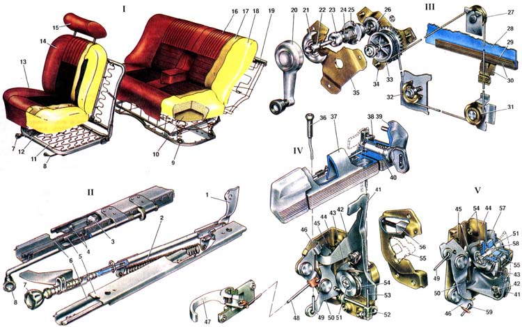 1. Усилитель спинки переднего сиденья; 2. Пружина механизма наклона спинки; 3. Ролик; 4. Шарики ползунов; 5. Ползуны салазок; 6. Направляющие салазок; 7. Винт с рукояткой механизма наклона спинок; 8. Рукоятка механизма передвижения сиденья; 9. Отверстие фиксации подушки сиденья; 10. Подложка набивки; 11. Пружина каркаса; 12. Каркас подушки; 13. Подушка; 14. Спинка; 15. Подголовник; 16. Обивка спинки заднего сиденья; 17. Подложка обивки; 18. Набивка спинки; 19. Каркас спинки заднего сиденья; 20. Ручка стеклоподъемника; 21. 0блицовка ручки; 22. Ведущий валик; 23. Поводок пружины тормоза; 24. Пружина тормоза; 25. Опора ведущего валика; 26. Ведущая шестерня; 27. Верхний ролик; 28. Опускное стекло двери; 29. Прокладка; 30. Обойма стекла; 31. Нижний ролик; 32. Натяжной ролик; 33. Барабан с ведомой шестерней; 34. Корпус стеклоподъемника: 35. Крышка корпуса; 36. Кнопка блокировки замка; 37. Наружная ручка двери; 38. Ловодок выключателя замка; 39. Корпус наружной ручки; 40. Выключатель замка; 41. Рычаг наружного привода замка; 42. Пружина рычага наружного привода; 43. Храповик; 44. Корпус замка; 45. Пружина рычага блокировки; 46. Рычаг внутреннего привода замка; 47. Внутренняя ручка двери; 48. Тяга внутреннего привода; 49. Тяга кнопки блокировки замка; 50. Рычаг блокировки замка; 51. Центральный валик; 52. Валик выключения замка; 53. Тяга выключателя замка; 54. Пружина храповика; 55. Ротор; 56. Сухарь фиксатора замка; 57. Опорная шайба; 58. Втулка центрального валика; 59. Промежуточная тяга внутреннего привода; 60. I.Сиденья; 61. II.Салазки переднего левого сиденья; 62. III.Стеклоподъемник передней правой двери; 63. IV.Замок передней левой двери; 64. V.Замок задней левой двери.