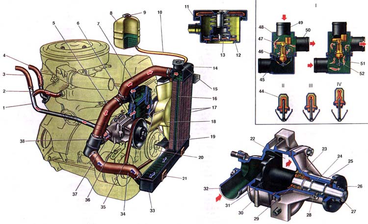 1. Трубка отвода жидкости от радиатора отопителя в насос охлаждающей жидкости; 2. Шланг отвода охлаждающей жидкости от впускной трубы. 3. Шланг отвода охлаждающей жидкости из радиатора отопителя; 4. Шланг подвода жидкости в радиатор отопителя; 5. Перепускной шланг термостата; 6. Выпускной патрубок рубашки охлаждения; 7. Подводящий шланг радиатора; 8. Расширительный бачок: 9. Пробка бачка; 10. Шланг от радиатора к расширительному бачку; 11. Пробка радиатора: 12. Выпускной клапан пробки; 13. Впускной клапан; 14. Верхний бачок радиатора; 15. Заливная горловина радиатора; 16. Трубка радиатора; 17. Охлаждающие пластины радиатора; 18. Кожух вентилятора; 19. Электровентилятор; 20. Шкив привода насоса охлаждающей жидкости; 21. Резиновая опора; 22. Окно со стороны блока цилиндров для подачи охлаждающей жидкости; 23. Обойма сальника; 24. Подшипник валика насоса охлаждающей жидкости; 25. Крышка насоса; 26. Ступица шкива привода насоса; 27. Валик насоса; 28. Стопорный винт; 29. Манжета сальника; 30. Корпус насоса; 31. Крыльчатка насоса; 32. Приемный патрубок насоса; 33. Нижний бачок радиатора; 34. Отводящий шланг радиатора; 35. Ремень привода насоса охлаждающей жидкости; 36. Насос охлаждающей жидкости; 37. Шланг подачи охлаждающей жидкости в насос: 38. Термостат; 39. Резиновая вставка; 40. Входной патрубок (от радиатора); 41. Основной клапан; 42. Перепускной клапан; 43. Корпус термостата; 44. Патрубок перепускного шланга; 45. Патрубок шланга для подачи охлаждающей жидкости в насос: 46. Крышка термостата; 47. Поршень рабочего элемента; 48. I. Схема работы термостата; 49. II.Температура жидкости менее 80 С: 50. III. Температура жидкости 80. 94 С; 51. IV. Температура жидкости более 94 С.