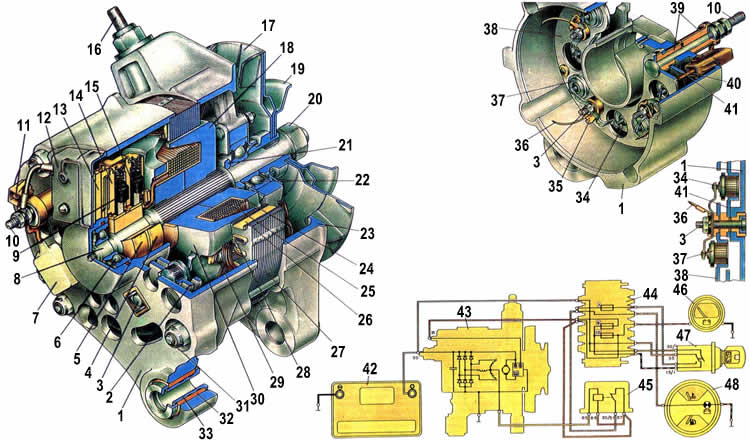 На автомобилях ВАЗ-2105 и ВАЗ-2104 устанавливают кислотную аккумуляторную батарею 6СТ-55, которая служит для питания потребителей автомоёиля электрическим током при неработающем двигателе, а также для пуска двигателя. Батарея состоит из шести последовательно соединенных элементов напряжением по 2В Каждый элемент размещен в отдельном отсеке корпуса и состоит из положительных и отрицательных пластин, разделенных пластмассовыми микропористыми сепараторами. В отсеки заливается электролит, состоящий из раствора серной кислоты в дистиллированной воде. Нормальный уровень электролита в элементах должен быть на 5-10 мм выше предохранительного щитка или верхнего края сепараторов. Если в заливном отверстии имеется глубокая горловина, то уровень электролита должен доходить до ее нижнего края. При этом отчетливо виден мениск в нижнем отверстии горловины. Плотность электролита полностью заряженной аккумуляторной батареи при 2j5 C должна быть 1,28 г/см' для умеренного климата и 1,22 г/см для тропического. На автомобилях могут устанавливаться аккумуляторные батареи, изготовленные на различных заводах (в том числе и импортные), поэтому они могут иметь различные конструктивные отличия, касающиеся в основном конструкции корпуса, но характеристики их одинаковы. Генератор Техническая характеристика Номинальное напряжение, Максимальная сила тока отдачи (при 13 В и частоте вращения ротора 5000 мин*). А45 Пределы регулируемого напряжения, В 14,1 +0.5 Направление вращения правое Максимальная частота вращения якоря, мин 13000 Передаточное отношение двигатель генератор: 2,04 Масса генератора без шкива. кг4.2 На автомобилях ВАЗ-2105 и ВАЗ-2104 устанавливается генератор переменного тока типа Г222. Он служит для питания потребителей автомобиля электрическим током и для зарядки аккумуляторной батареи. С -1988 г. стал применяться генератор 37.3701 (от автомобилей ВАЗ-2108). Устройство его такое же, как и генератора Г-222, а отличается он только данными обмоток ротора и статора, регулятором напряжения и выпрямительным едоком, в котором установлено дополнительно три диода для питания обмотки возбуждения ротора. Максимальный ток отдачи этого генератора равен 55 А Выбор генератора переменного тока объясняется тем, что он имеет ряд серьезных преимуществ перед генераторами постоянного тока. В первую очередь это то, что он развивает напряжение, достаточное для заряда аккумуляторной батареи при значительно меньших оборотах, чем генератор постоянного тока. Далее, генератор переменного тока имеет меньший вес и габариты, чем равный по мощности генератор постоянного тока. У генератора постоянного тока с коллекторных пластин через щетки снимается весь ток нагрузки, в то время как у генератора переменного тока коллектор отсутствует и в обмотку якоря через контактные кольца и щетки подводится лишь небольшой по величине ток возбуждения генератора. Поэтому износ щеток и контактных колец невелик, и срок службы генератора переменного тока значительно дольше. Генератор установлен на двигателе с правой стороны и приводится во вращение клинаременной передачей от шкива коленчатого вала. Через отверстия в ушках крышек 23 генератор крепится болтом к литому чугунному кронштейну на двигателе и шпилькой к натяжной планке. Чтобы при затяжке болта не обломились ушки крышек, в отверстии ушка крышк