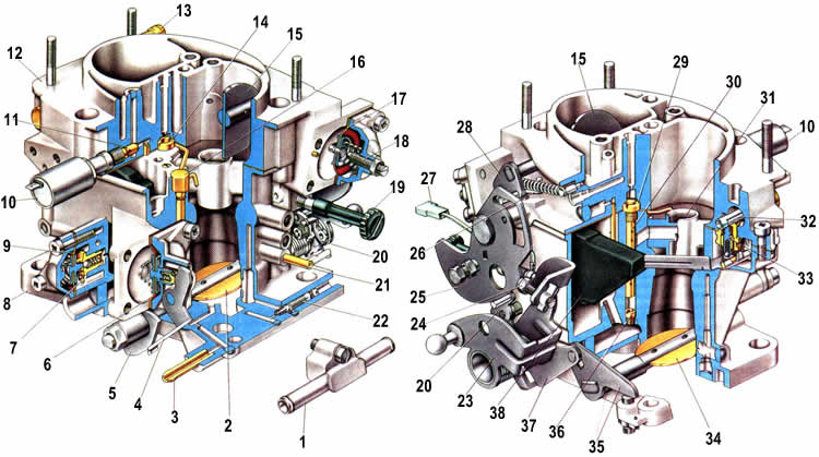 1. Блок подогрева карбюратора; 2. Дроссельная заслонка первой камеры; 3. Патрубок отсоса картерных газов; 4. Рычаг привода ускорительного насоса; 5. Кулачок привода ускорительного насоса; 6. Диафрагма ускорительного насоса; 7. Топливный жиклер экономайзера мощностных режимов; 8. Корпус карбюратора; 9. Диафрагма экономайзера мощностных режимов; 10. Электромагнитный запорный клапан; 11. Топливный жиклер холостого хода; 12. Крышка карбюратора; 13. Патрубок подачи топлива; 14. Главный воздушный жиклер первой камеры; 15. Воздушная заслонка; 16. Распылители ускорительного насоса с клапаном подачи топлива; 17. Диафрагма пускового устройства; 18. Регулировочный винт пускового устройства; 19. Регулировочный винт количества смеси холостого хода; 20. Рычаг блокировки второй камеры; 21. Патрубок подачи разрежения к вакуумному регулятору распределителя зажигания; 22. Регулировочный винт качества смеси холостого хода; 23. Рычаг привода дроссельных заслонок; 24. Регулировочный винт приоткрывания дроссельной заслонки первой камеры; 25. Рычаг управления воздушной заслонкой; 26. Шток пускового устройства; 27. Электрический провод концевого выключателя экономайзера холостого хода; 28. Рычаг воздушной заслонки; 29. Главный воздушный жиклер второй камеры; 30. Эмульсионная трубка второй камеры; 31. Распылитель главной дозирующей системы второй камеры; 32. Топливный фильтр; 33. Игольчатый клапан поплавковой камеры; 34. Дроссельная заслонка второй камеры; 35. Рычаг дроссельной заслонки второй камеры; 36. Главный топливный жиклер второй камеры; 37. Рычаг привода дроссельной заслонки второй камеры; 38. Поплавок.