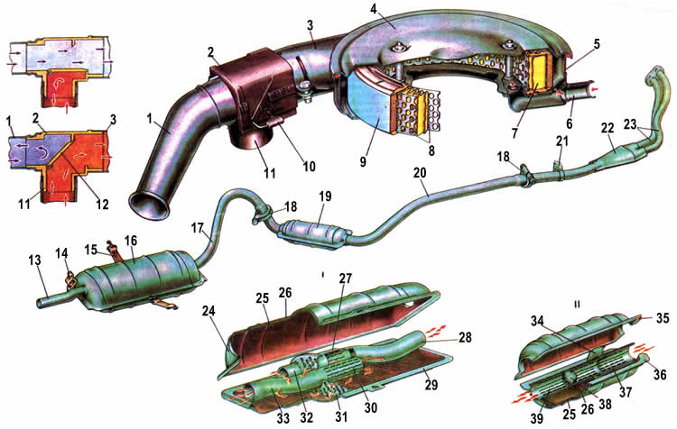 Воздушный Фильтр обеспечивает очистку воздуха, поступающего в карбюратор, от механических примесей. На двигателе устанавливается одноступенчатый воздушный фильтр сухого типа со сменным фильтрующим элементом, имеющим предочиститель. Воздушный фильтр имеет сезонную регулировку температуры забираемого воздуха. Корпус 5 воздушного фильтра отштампован из стального листа. Корпус фильтра устанавливается на фланце карбюратора на четыре шпильки и крепится самоконтрящимися гайками. На карбюраторе фильтр уплотнен резиновой прокладкой. Сверху корпус фильтра закрывается крышкой 4 с резиновой уплотнительной прокладкой. Крышка крепится тремя гайками, навернутыми на оси с дистанционными выступами. Корпус и крышка покрашены черной эмалью. Фильтрующий элемент изготовлен из специального фильтрующего картона 7, вставленного в металлические перфорированные оболочки 8. С наружной стороны надевается фильтрующий элемент 9 из синтетической ваты для предварительной очистки воздуха (предочиститель), увеличивающий пылеемкость фильтра. Фильтрующий элемент устанавливается в корпус 5 и прижимается крышкой 4. Эластичные обеды фильтрующего элемента обеспечивают герметичность соединений элемента с корпусом и крышкой. С нижней стороны к корпусу фильтра приварен коллектор 6 вытяжной вентиляции картера двигателя, который соединяется с пространством за фильтрующим элементом. Очищать и восстанавливать фильтрующий элемент завод не рекомендует, так как при этом возможны повреждения фильтрующего картона, а следовательно, появляется вероятность абразивного износа цилиндров двигателя. Терморегулятор. Терморегулятор 2 состоит из пластмассового корпуса с заслонкой 12, положение которой можно изменять рукояткой 10. Терморегулятор установлен на патрубке 3 воздушного фильтра и крепится стяжным болтом. Снизу корпус терморегулятора имеет патрубок 11 забора теплого воздуха от дефлектора, расположенного на выпускном коллекторе. Патрубок И соединен с дефлектором гофрированным шлангом. На корпус терморегулятора надет заборник холодного воздуха из подкапотного пространства. Для снижения шума всасывания воздуха заборник изготовлен из по- липропилана. В зависимости от температуры окружающего воздуха заслонку 12 устанавливают рукояткой 10 в одно из трех положений: 1) НОТ - из зоны выпускного коллектора поступает теплый воздух по гофрированному шлангу и патрубку И; 2) COLD - через заборник поступает холодный воздух; 3) промежуточное положение. На некоторых автомобилях устанавливается терморегулятор с автоматическим приводом заслонки 12 от термосилового элемента, установленного внутри терморегулятора и позволяющего автоматически поддерживать температуру воздуха на входе в воздушный фильтр. Сверху указанного терморегулятора находится дополнительный пневмопривод заслонки, соединенный шлангом с полостью впускной трубы. Диапазон работы термосилового элемента от +30 до +42 "С. При работе двигателя на холостом ходу за счет увеличенного разрежения во впускной трубе пневмопривод действует на заслонку терморегулятора и обеспечивает поступление в воздушный фильтр теплого воздуха, чем достигается более полное сгорание рабочей смеси в цилиндрах двигателя, а следовательно, снижение токсичности отработавших газов. В нормальных условиях эксплуатации автомоб