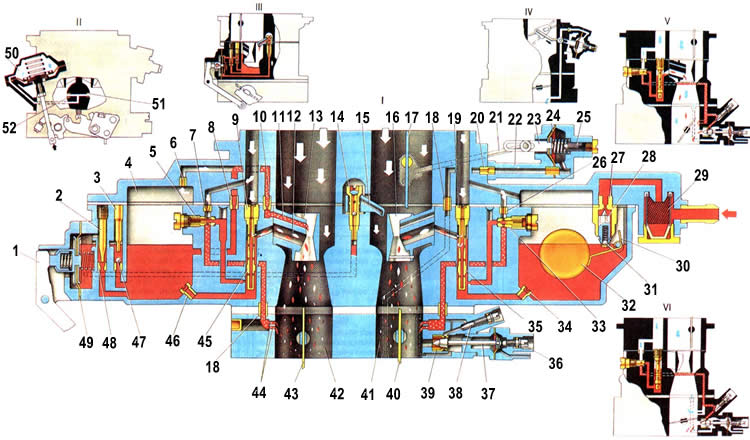 1. Рычаг ускорительного насоса; 2. Винт регулирования подачи топлива ускорительным насосом; 3. Пробка обратного клапана ускорительного насоса; 4. Поплавковая камера: 5. Топливный жиклер переходной системы второй камеры; 6. Воздушный жиклер эконостата; 7. Воздушный жиклер переходной системы второй камеры; 8. Топливный жиклер эконостата: 9. Главный воздушный жиклер второй камеры; 10. Эмульсионный жиклер эконостата; 11. Распылитель эконостата: 12. Распылитель главной дозирующей системы второй камеры* 13. Малый диффузор второй камеры; 14. Клапан распылителя ускорительного насоса; 15. Распылитель ускорительного насоса: 16. Малый диффузор первой камеры: 17. Воздушная заслонка; 18. Соидинительная втулка воздушного канала пускового устройства; 19. Главный воздушный жиклер первой камеры; 20. Воздушный жиклер пускового устройства; 21. Тяга рычага воздушной заслонки; 22. Корпус пусковою устройства; 23. Шток пускового усгройства; 24. Диафрагма пускового устройства; 25. Регулировочный винт пускового устройства; 26. Воздушный жиклер системы холостого хода; 27. Седло игольчатого клапана; 28. Игольчатый клапан; 29. Топливный фильтр; 30. Кронштейн поплавка с упором и язычком; 31. Шарик демпфера игольчатого клапана; 32. Поплавок; 33. Топливный жиклер системы холостого хода; 34. Главный топливный жиклер первой камеры; 35. Эмульсионная трубка первой камеры; 36. Регулировочный ринт количества смеси холостого хода; 37. Игла экономайзера принудительного холостого хода; 38. Регулировочный винт состава (качества) смеси холостого хода; 39. Седло иглы экономайзера принудительного холостого хода; 40. Дроссельная заслонка первой камеры; 41. Первая смесительная камера; 42. Вторая смесительная камера; 43. Дроссельная заслонка второй камеры; 44. Нерегулируемые отверстия переходной системы второй камеры; 45. Эмульсионная трубка второй камеры; 46. Главный топливный жиклер второй камеры; 47. Обратный клапан ускорительного насоса; 48. Перепускной жиклер ускорительного насоса; 49. Диафрагма ускорительного насоса; 50. Пневмопривод дроссельной заслонки второй камеры: 51. Жиклер пневмопривода, расположенный в первой камере: 52. Жиклер пневмопривода. расположенный во второй камере; 53. I.Работа карбюратора на режиме максимальной мощности двигателя; 54. II.Работа пневмопривода дроссельной заслонки второй камеры; 55. III.Работа ускорительного насоса; 56. IV.Работа диафрагменного пускового устройства; 57. V.Работа карбюратора при переходе на средние нагрузки; 58. VI.Работа карбюратора на режиме холостого хода.