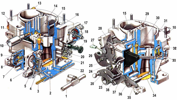 1. Блок подогрева карбюратора; 2. Дроссельная заслонка первой камеры; 3. Патрубок отсоса картерных газов; 4. Рычаг привода ускорительного насоса; 5. Кулачок привода ускорительного насоса; 6. Диафрагма ускорительного насоса; 7. Топливный жиклер экономайзера мощностных режимов; 8. Корпус карбюратора; 9. Диафрагма экономайзера мощностных режимов; 10. Электромагнитный запорный клапан; 11. Топливный жиклер холостого хода; 12. Крышка карбюратора; 13. Патрубок подачи топлива; 14. Главный воздушный жиклер первой камеры; 15. Воздушная заслонка; 16. Распылители ускорительного насоса с клапаном подачи топлива; 17. Диафрагма пускового устройства; 18. Регулировочный винт пускового устройства; 19. Регулировочный винт количества смеси холостого хода; 20. Рычаг блокировки второй камеры; 21. Патрубок подачи разрежения к вакуумному регулятору распределителя зажигания; 22. Регулировочный винт качества смеси холостого хода; 23. Рычаг привода дроссельных заслонок; 24. Регулировочный винт приоткрывания дроссельной заслонки первой камеры; 25. Рычаг управления воздушной заслонкой; 26. Шток пускового устройства; 27. Электрический провод концевого выключателя экономайзера холостого хода; 28. Рычаг воздушной заслонки; 29. Главный воздушный жиклер второй камеры; 30. Эмульсионная трубка второй камеры; 31. Распылитель главной дозирующей системы второй камеры; 32. Топливный фильтр; 33. Игольчатый клапан поплавковой камеры; 34. Дроссельная заслонка второй камеры; 35. Рычаг дроссельной заслонки второй камеры; 36. Главный топливный жиклер второй камеры; 37. Рычаг привода дроссельной заслонки второй камеры; 38. Поплавок.