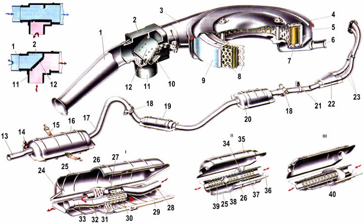 1. Патрубок забора холодного воздуха; 2. Терморегулятор; 3. Патрубок воздушного фильтра; 4. Крышка фильтра; 5. Корпус воздушного фильтра; 6. Коллектор вытяжной вентиляции картера двигателя; 7. Бумажный фильтрующий элемент; 8. Перфорированные оболочки фильтрующего элемента; 9. Предочиститель фильтрующего элемента; 10. Рукоятка заслонки терморегулятора: 11. Патрубок забора теплого воздуха; 12. Заслонка терморегулятора; 13. Выпускная труба; 14. Подушка подвески глушителя; 15. Ремень подвески глушителя; 16. Основной глушитель; 17. Передняя труба основного глушителя: 18. Хомут крепления труб; 19. Задний дополнительный глушитель; 20. Передний дополнительный глушитель; 21. Хомут крепления приемной трубы к коробке передач; 22. Газоприемник; 23. Приемные трубы глушителей; 24. Верхний полукорпус основного глушителя; 25. Теплоизоляция кожуха; 26. Кожух глушителя; 27. Кожух левой трубы; 28. Впускной патрубок; 29. Нижний полукорпус основного глушителя; 30. Перфорация на трубах для гашения энергии газов; 31. Перфорированная перегородка; 32. Левая труба; 33. Выпускной патрубок; 34. Глухая перегородка; 35. Верхний полукорпус дополнительного глушителя: 36. Нижний полукорпус дополнительного глушителя; 37. Передняя перфорированная труба; 38. Диафрагма; 39. Задняя перфорированная труба; 40. Перфорированная труба; 41. I.Основной глушитель; 42. II.Передний дополнительный глушитель: 43. III.Задний дополнительный глушитель.