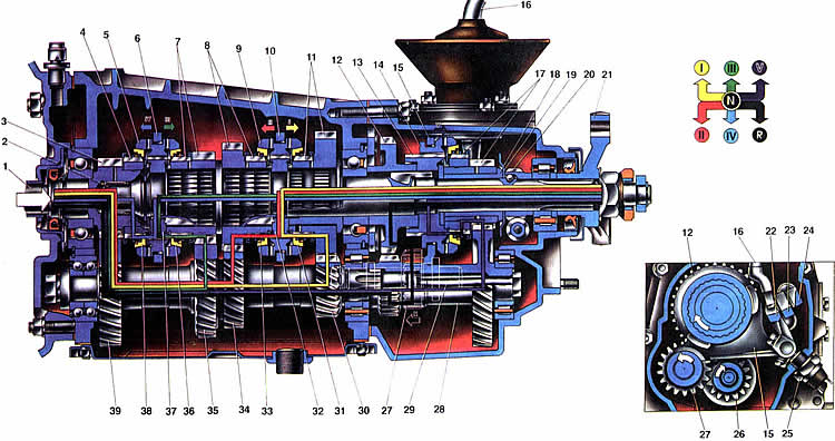1. Первичный вал; 2. Вторичный вал; 3. Шестерня постоянного зацепления первичного вала; 4. Зубчатый венец синхронизатора IV передачи; 5. Скользящая муфта синхронизатора III и IV передач; 6. Вилка включения III и IV передач; 7. Шестерня и зубчатый венец синхронизатора III передачи; 8. Шестерня и зубчатый венец синхронизатора И передачи; 9. Скользящая муфта синхронизатора I и II передач; 10. Вилка включения I и II передач; 11. Шестерня и зубчатый венец синхронизатора I передачи; 12. Шестерня заднего пода; 13. Ступица муфты синхронизатора V передачи; 14. Скользящая муфта синхронизатора V передач; 15. Вилка включения V передачи и заднего хода; 16. Рычаг переключения передач; 17. Шестерня и зубчатый венец синхронизатора V передачи; 18. Втулка шестерни V передачи; 19. Маслоотражательная шайба; 20. Ведущая шестерня привода спидометра; 21. Фланец эластичной муфты; 22. Шток вилки включения V передачи и заднего хода: 23. Шток вилки включения III и IV передач; 24. Шток вилки включения I и II передач; 25. Включатель фонаря заднего хода; 26. Шестерня заднего хода блока шестерен; 27. Промежуточная шестерня заднего хода; 28. Блок шестерен V передачи и заднего хода; 29. Ось промежуточной шестерни заднего хода; 30. Шестерня I передачи промежуточного вала; 31. Блокирующее кольцо синхронизатора I передачи; 32. Ступица муфты синхронизатора I и II передач; 33. Блокирующее кольцо синхронизатора И передачи; 34. Шестерня И передачи промежуточного вала; 35. Шестерня III передачи промежуточного вала; 36. Блокирующее кольцо синхронизатора III передачи; 37. Ступица муфты синхронизатора III и IV передач; 38. Блокирующее кольцо синхронизатора IV передачи; 39. Шестерня постоянного зацепления промежуточного вала.