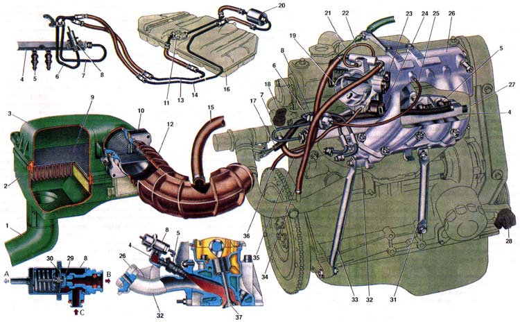 1. Патрубок подачи воздуха; 2. Корпус воздушного фильтра; 3. Крышка воздушного фильтра; 4. Топливная рамка: 5. Форсунка; 6. Трубка слива топлива; 7. Трубка подачи топлива; 8. Регулятор давления; 9. Фильтрующий элемент: 10. Датчик массового расхода воздуха; 11. Электробензонасос с датчиком уровня топлива; 12. Шланг впускной трубы (соединяется с дроссельным патрубком); 13. Магистраль слива топлива. 14. Магистраль подачи топлива; 15. Шланг подвода партерных газов от крышки головки цилиндров; 16. Топливный бак; 17. Жгут проводов форсунок; 18. Датчик температуры охлаждающей жидкости; 19. Дроссельный патрубок; 20. Топливный фильтр; 21. Трос привода дроссельной заслонки; 22. Шланг отсоса картерных газов на холостом ходу; 23. Датчик положения дроссельной заслонки: 24. Регулятор холостого хода; 25. Шланг подачи разрежения к регулятору давления; 26. Ресивер: 27. Пробка штуцера для присоединения манометра: 28. Датчик положения коленчатого вала; 29. Клапан регулятора давления: 30. Диафрагма регулятора давления; 31. Опорный кронштейн: 32. Впускная труба: 33. Поддерживающий кронштейн: 34. Шланг отвода жидкости от дроссельного патрубка; 35. Шланг подвода жидкости для подогрева дроссельного патрубка: 36. Шланг дпя отсоса паров бензина из адсорбера ; 37. Впускной клапан; 38. А.Отсос воздуха к дроссельному патрубку: 39. Б.Слив топлива в топливный бак, 40. С.Подвод топлива из топливной рампы.