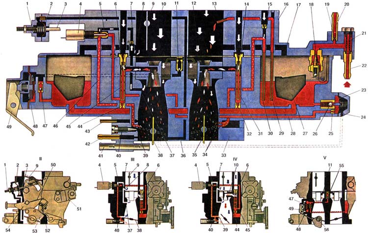 1. Регулировочный винт пускового устройства: 2. Диафрагма пускового устройства; 3. Шток пускового устройства: 4. Запорный электромагнитный клапан; 5. Топливный жиклер холостого хода: 6. Главный воздушный жиклер первой камеры: 7. Воздушный жиклер холостого хода; 8. Проточный канал холостого хода: 9. Воздушная заслонка: 10. Распылитель главной дозирующей системы первой камеры: 11. Распылители ускорительного насоса: 12. Распылитель главной дозирующей системы второй камеры: 13. Впрыскивающая трубка эконостата: 14. Главный воздушный жиклер второй камеры: 15. Воздушный жиклер переходной смсгемы второй камеры: 16. Крышка карбюратора: 17. Отверстие балансировки поплавковой камеры; 18. Игольчатый клапан: 19. Калиброванное отверстие перепуска топлива в бак: 20. Патрубок слива топлива в бак; 21. Топливный фильтр: 22. Патрубок подачи топлива: 23. Диафрагма экономайзера мощностных режимов: 24. Воздушный канал экономайзера мощностных режимов: 25. Топливный жиклер экономайзера мощностных режимов: 26. Шариковый клапан экономайзера мощностных режимов: 27. Поплавок; 28. Топливный канал экономайзера мощностных режимов; 29. Топливный жиклер эконостата с трубкой: 30. Топливный жиклер переходной системы второй камеры с трубкой: 31. Эмульсионная трубка второй камеры: 32. Главный топливный жиклер второй камеры: 33. Корпус карбюратора: 34. Выходные отверстия переходной системы второй камеры; 35. Дроссельная заслонка второй камеры: 36. Воздушный канал пускового устройства; 37. Отверстие воздушного канала холостого хода: 38. Дроссельная заслонка первой камеры; 39. Щель переходной системы первой камеры; 40. Регулировочный винт качества смеси холостого хода: 41. Блок подогрева карбюратора; 42. Патрубок для отсоса картерных газов: 43. Патрубок для подачи разрежения к вакуумному регулятору распределителя зажигания; 44. Главный топливный жиклер первой камеры; 45. Эмульсионная трубка первой камеры: 46. Эмульсионный канал холостого хода; 47. Шариковый клапан ускорительного насоса: 48. Диафрагма ускорительного насоса; 49. Рычаг привода ускорительного насоса: 50. Тяга рукоятки привода воздушной заслонки; 51. Кронштейн крепления оболочки тяги привода воздушной заслонки: 52. Регулировочный винт приоткрывания дроссельной заслонки первой камеры; 53. Рычаг привода дроссельных заслонок: 54. Рычаг управления воздушной заслонкой: 55. Шариковый клапан подачи топлива ускорительного насоса: 56. Кулачок привода ускорительного насоса: 57. I.Работа карбюратора при максимальной мощности двигателя; 58. II.Работа пускового устройства; 59. III.Работа карбюратора на холостом ходу двигателя; 60. IV.Работа карбюратора при переходе на средние нагрузки двигателя: 61. V.Работа ускорительного насоса.