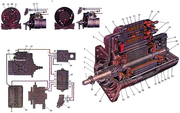 1. Вал якоря: 2. Шестерня привода; 3. Втулка шестерни; 4. Ролик муфты свободного хода; 5. Кожух муфты: 6. Ось рычага привода шестерни; 7. Крышка стартера со стороны привода; 8. Рычаг привода шестерни; 9. Якорь тягового реле; 10. Корпус тягового реле; 11. Втягивающая обмотка тягового реле; 12. Удерживающая обмотка тягового реле; 13. Шток тягового реле; 14. Сердечник тягового реле; 15. Контактная пластина; 16. Крышка тягового реле; 17. Контактные болты; 18. Торцевой коллектор; 19. Щетка; 20. Пружина щетки; 21. Втулка крышки стартера; 22. Кожух; 23. Стяжной болт; 24. Крышка стартера со стороны коллектора; 25. Обмотка якоря; 26. Сердечник якоря; 27. Обмотка статора: 28. Полюс статора; 29. Корпус стартера; 30. Ограничительный диск: 31. Поводковое кольцо: 32. Центрирующий диск: 33. Буферная пружина; 34. Наружное кольцо муфты свободного хода; 35. Ступица муфты свободного хода; 36. Ограничительное кольцо хода шестерни; 37. Направляющий стержень; 38. Плунжер; 39. Стартер; 40. Вспомогательное реле включения стартера; 41. Монтажный блок; 42. Выключатель зажигания: 43. Генератор; 44. Аккумуляторная батарея: 45. I.Схема работы обгонной муфты.