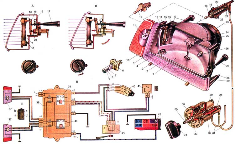 Для освещения дороги в темное время суток устанавливаются две блок-фары (правая и левая). Они состоят из прямоугольных фар с лампами головного и габаритного света, сблокированных с секцией бокового указателя поворота. Блок-фары крепятся к передку автомобиля четырьмя шпильками 28 и гайками с зубчатой кромкой, которые предохраняют их от самоотворачивания. Ближний и дальний свет фар переключается левым рычагом подрулевого переключателя 43, если включен выключатель наружного освещения. Кроме того, в электрической схеме предусмотрена возможность световой сигнализации, т.е. кратковременного включения дальнего света фар при любом положении выключателя наружного освещения. В этом случае дальний свет фар включается оттягиванием на себя левого рычага подрулевого переключателя, а питание на контакты световой сигнализации в переключателе 43 фар подается непосредственно от штекера "INT" выключателя зажигания 40, минуя выключатель наружного освещения. Нити двух ламп головного света фар потребляют довольно значительный ток 8-10 А. Поэтому, чтобы разгрузить контакты переключателя 43 фар и увеличить его долговечность, фары включаются не напрямую переключателем 43, а через дополнительные реле 39 и 44 типа 113.3747. Они обладают мощными контактами и установлены в монтажном блоке 38. Реле 39 включает ближний свет в обеих фарах, а реле 44 - дальний свет. В результате через контакты переключателя фар протекает только ток питания обмоток реле, не превышающий 0,2 А. Рефлектор 1 фары изготовлен из стали и имеет форму параболоида, ограниченного сверху и снизу горизонтальными плоскостями. Для создания зеркальной отражающей поверхности рефлектор внутри покрывается специальным термостойким лаком, а затем на него в вакууме наносится тонкий слой алюминия. Такое покрытие отражает от 90% падающего на него света. Рассеиватель 5 фары выполнен из бесцветного силикатного стекла с высокой степенью прозрачности. На его внутренней поверхности отпрессована сложная система линз и призм, рассеивающих свет в горизонтальной плоскости и концентрирующих световой поток в необходимых направлениях согласно международным нормам. Лампа 24 головного света фары галогенная. Колба лампы изготовлена из кварцевого стекла и заполнена парами йода (галогена) и каким-либо инертным газом. Галогенные лампы обладают повышенной световой отдачей, что обеспечивается более высокой температурой нагрева нити и повышенным сроком службы из-за химического процесса, происходящего в лампе. Этот процесс заключается в следующем. При горении с нити накала испаряются частички вольфрама и осаждаются на стенках лампы. Пары йода соприкасаются с ними и при температуре около GOO'C образуется йодистый вольфрам. Это соединение неустойчиво при высоких температурах и, попадая в зону раскаленной нити, разлагается на йод и вольфрам, который осаждается на нить, а йод перемещается к стенкам колбы. Таким образом, у включенной лампы происходит постоянный перенос вольфрама со стенок на нить. Поэтому стенки колбы остаются чистыми, нить медленнее утоньшается, и долговечность лампы увеличивается. При замене галогенных ламп необходимо соблюдать осторожность и брать лампу перчатками или платком, чтобы не оставить жировых следов от пальцев на стекле лампы. Если же такие следы на лампе имеются, то удалить их спиртом. Жиро