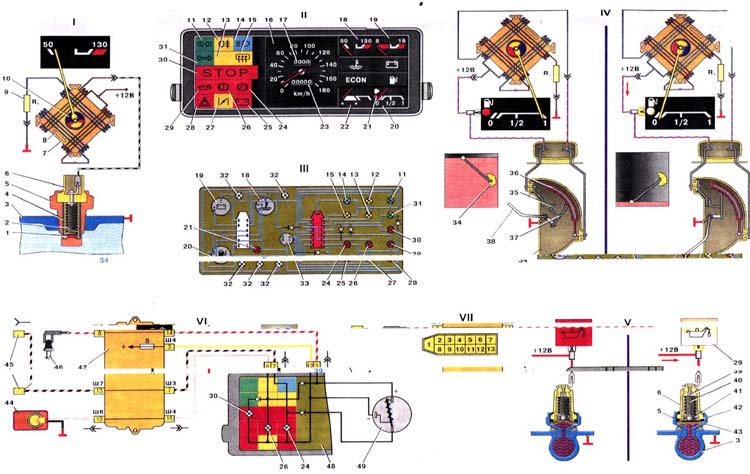 Все контрольные приборы и контрольные лампы автомобиля объединены в единый узел комбинацию приборов типа 22.3801. Комбинаций приборов объединяем в себе спидометр 16, эконометр 22, вольтметр 19. указатель 20 уровня топлива и указатель 18 температуры охлаждающей жидкости. Кроме того, слева в отдельной секции размещены контрольные лампы. Электрические соединения между приборами, контрольными лампами и выводными штекерами выполнены методом печатного монтажа на плате из фольгированного гетинакса. Спидометр 16 крепится к корпусу комбинации приборов двумя винтами. Он имеет стрелочный указатель скорости и два счетчика: суммирующий 23 и суточный 17 пройденного пути, показания которого можно устанавливать на нуль рукояткой, вынесенной на панель приборов. Механизмы спидометра приводятся в действие гибким валом от привода, установленного на картере сцепления. Один оборот гибкого вала соответствует 1 м пройденного пути. Эконометр, установленный в комбинации приборов, служит для ориентировочного определения расхода топлива на данном режиме работы двигателя. Он представляет собой вакуумметр, измеряющий разрежение во впускной трубе двигателя, с которым непосредственно связан расход топлива. Чем меньше открыты дроссельные заслонки в карбюраторе, тем больше разрежение во впускной трубе, а расход топлива меньше. И наоборот, при больших нагрузках на двигатель дроссельные заслонки открываются почти полностью, разрежение падает (стрелка эконометра переходит в желтую зону шкалы), а расход топлива увеличивается. Указатель температуры охлаждающей жидкости работает в паре с датчиком ТМ-106. Механизм прибора состоит из пластмассового разъемного каркаса 7, на котором намотаны катушки, и оси со стрелкой и дисковым постоянным магнитом 10. В задней половине каркаса находится небольшой магнит 8, возвращающий дисковый магнит со стрелкой в начало шкалы. Катушки имеют три обмотки, одна из которых намотана перпендикулярно двум другим. Таким образом, на дисковый магнит действуют три магнитных потока, создаваемых тремя обмотками. В зависимости от сопротивления датчика меняется величина силы тока в обмотках катушек и поэтому меняются направление и величина суммарного магнитного потока, действующего на дисковый магнит. Полюса этого магнита располагаются вдоль направления суммарного магнитного потока и, соответственно, стрелка отклоняется на определенный угол. Если сопротивление датчика составляет 640-1320 Ом. стрелка должна находиться в начале шкалы, при сопротивлении 77-89 Ом в начале красной зоны, а при сопротивлении датчика 40- 50 Ом отклоняться до конца красной зоны шкалы. Датчик ТМ-Юб указателя температуры заворачивается в головку цилиндров с задней стороны двигателя. Чувствительным элементом в датчике является терморезистор 1, изменяющий свое сопротивление при изменении температуры. Терморезистор прижат пружиной к донышку корпуса, т.е. одна его сторона через корпус соединена с "массой". Другая сторона через пружину соединена со штекером, закрепленным в пластмассовой крышке 6. Указатель уровня топлива имеет такое же устройство. как и указатель температуры. Отличается данными обмоток, точками крепления к печатной плате и взаимным расположением дискового магнита и стрелки. Указатель применяется в паре с датчиком типа 24.3827, который устанавливается в то