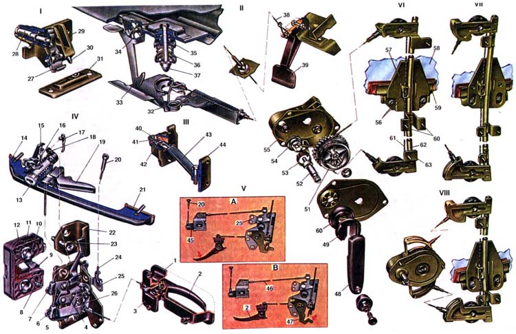 1. Облицовка внутренней ручки двери; 2. Внутренняя ручка двери; 3. Кронштейн внутренней ручки; 4. Промежуточный рычаг; 5. Корпус внутреннего замка двери; 6. Рычаг наружного привода; 7. Рычаг выключения замка; 8. Палец привода замка; 9. Собачка храповика: 10. Храповик; 11. Крышка наружного замка; 12. Корпус наружного замка; 13. Выключатель замка; 14. Наружная ручка двери; 15. Поводок клавиши; 16. Тяга наружного привода: 17. Тяга выключения; 18. Поводок выключателя замка; 19. Клавиша; 20. Кнопка выключения замка; 21. Прокладка наружной ручки; 22. Корпус фиксатора; 23. Палец фиксатора; 24. Тяга кнопки выключения; 25. Рычаг выключения; 26. Рычаг внутреннего привода; 27. Крючок замка двери задка; 28. Кнопка в сборе: 29. Корпус замка двери задка; 30. Шип замка; 31. Фиксатор замка двери задка; 32. Пружина замка капота: 33. Крючок капота: 34. Пружина крючка: 35. Контргайка штыря: 36. Пружина штыря; 37. Штырь; 38. Тяга рукоятки замка капота; 39. Рукоятка замка капота; 40. Штифт; 41. Сухарь; 42. Ролик; 43. Стержень; 44. Кронштейн; 45. Рычаг привода выключения замка: 46. Тяга внутреннего привода выключения замка; 47. Рычаг блокировки внутренней ручки двери; 48. Рычаг ручки стеклоподъемника; 49. Облицовка ручки стекло- подъемника: 50. Розетка; 51. Барабан с ведомой шестерней; 52. Ведущий валик; 53. Пружина тормоза; 54. Ведущая шестерня: 55. Корпус механизма стекло- подъемника; 56. Пружины троса; 57. Пластина; 58. Опускное стекло; 59. Обойма стекла; 60. Шпильки крепления стеклоподъемника: 61. Трос; 62. Направляющая труба; 63. Нижний кронштейн направляющей трубы; 64. I.Замок двери задка; 65. II.Замок капота: 66. III.Ограничитель открывания двери; 67. IV.Замок передней двери: 68. V.Схема привода замка задней двери автомобиля ВАЗ-2109; 69. а)внутренняя ручка двери разблокирована; 70. в)внутренняя ручка двери заблокирована; 71. VI.Стеклоподъемник передней двери автомобиля ВАЗ-2108; 72. VII.Стеклоподъемник передней двери автомобиля ВАЗ-2109; 73. VIII.Стеклоподъемник задней двери автомобиля ВАЗ-2109.