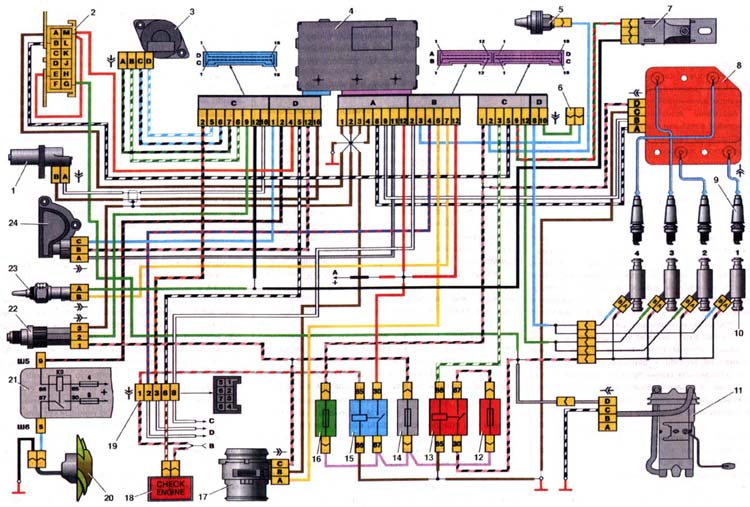 Система подачи топлива включает в себя электробензонасос 11, топливный фильтр 20, топливопроводы и рампу 4 форсунок в сборе с форсунками 5 и регулятором 8 давления топлива. Электробензонасос И двухступенчатый роторного типа, установлен в топливном баке. Топливо из насоса через топливный фильтр 20 тонкой очистки подается в топливную рампу под давлением более 284 кПа. Электробензонасос включается с помощью вспомогательного реле 13 (см. рис. 42). Топливный фильтр с бумажным фильтрующим элементом установлен под полом кузова за топливным баком. Рампа 4 форсунок представляет собой полую планку с установленными на ней форсунками и регулятором давления топлива. Рамка форсунок закреплена двумя болтами на впускной трубе 32. С правой стороны на рампе форсунок находится штуцер для контроля давления топлива, закрытый резьбовой пробкой 27. Форсунка 5 представляет собой электромагнитный клапан. Когда на нее от ЭБУ поступает импульс напряжения, то клапан открывается, и топливо через распылитель тонко распыленной струей под давлением впрыскивается во впускную трубу на впускной клапан. После прекращения подачи электрического импульса подпружиненный клапан форсунки перекрывает подачу топлива. Форсунки закреплены на рампе с помощью пружинных фиксаторов. Верхний и нижний концы форсунок герметизируются резиновыми уплотнительными кольцами. Регулятор 8 давления топлива состоит из клапана 29 с диафрагмой 30, поджатого пружиной к седлу в корпусе регулятора. Назначение регулятора поддерживать постоянный перепад давления между давлением воздуха во впускной трубе и давлением топлива в рампе. На работающем двигателе регулятор поддерживает давление в рампе форсунок в пределах 284- 325 кПа. На диафрагму регулятора с одной стороны действует давление топлива, а с другой давление (разрежение) во впускной трубе. При уменьшении давления во впускной трубе (дроссельная заслонка закрывается) клапан регулятора открывается при меньшем давлении топлива, перепуская избыточное топливо по сливной магистрали обратно в бак. Давление топлива в рампе понижается. При увеличении давления во впускной трубе (приоткрывании дроссельной заслонки) клапан регулятора открывается уже при большем давлении топлива в рампе повышается. Датчик 18 температуры охлаждающей жидкости представляет собой термистр (резистор, сопротивление которого изменяется от температуры). Датчик завернут в выпускной патрубок охлаждающей жидкости на головке цилиндров. При низкой температуре датчик имеет высокое сопротивление (100 ком при -40 "С), а при высокой температуре - низкое (177 Ом при 100 "С). Датчик концетрации кислорода применяется в системе впрыска с обратной связью и устанавливается на приемной трубе глушителей. Кислород, содержащийся в отработавши газах, реагирует с датчиком кислорода, создавая разность потенциалов на выходе датчика. Она изменяется приблизительно от 0,1 В (высокое содержание кислорода бедная смесь) до 0.9В (мало кислорода богатая смесь). В датчик встроен нагревательный элемент для повышения эффективности его работы. Датчик 10 массового расхода воздуха расположен между воздушным фильтром и шлангом 12 впускной трубы. Он термоанемометрического типа. В датчике используются три чувствительных элемента, един из элементов определяет температуру окружающего воздуха, а две остальных наг