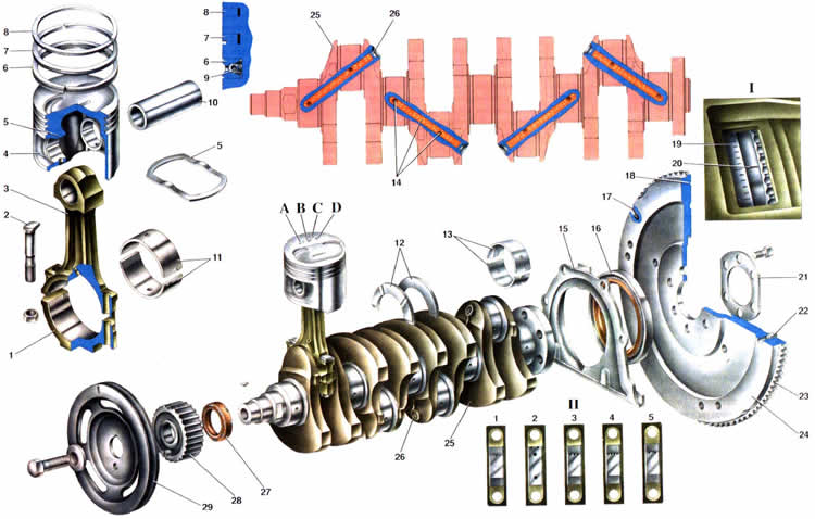 Кривошипно-шатунный механизм служит для преобразования поступательного движения поршня под действием энергии расширения продуктов сгорания топлива во вращательное движение коленчатого вала. Механизм состоит из поршня с поршневыми кольцами и пальцем, шатуна, коленчатого вала и маховика. Поршень 4 отливается из высокопрочного алюминиевого сплава. Поскольку алюминий имеет высокий температурный коэффициент линейного расширения, то для исключения опасности заклинивания поршня в цилиндре в головке поршня над отверстием для поршневого пальца залита терморегулирующая стальная пластина 5. Поршни, так-же как и цилиндры, по наружному диаметру сортируются на пять классов: Измерять диаметр поршня для определения его класса можно только в одном месте: в плоскости, перпендикулярной поршневому пальцу на расстоянии 51,5 мм от днища поршня. В остальных местах диаметр поршня отличается от номинального, т.к. наружная поверхность поршня имеет сложную форму. В поперечном сечении она овальная, а по высоте коническая. Такая форма позволяет компенсировать неравномерное расширение поршня из-за неравномерного распределения массы металла внутри поршня. На наружной поверхности поршня нанесены кольцевые микроканавки глубиной до 14 микрон. Такая поверхность способствует лучшей приработке поршня, так как в микроканавках задерживается масло. В нижней части бобышек под поршневой палец имеются отверстия для прохода масла к поршневому пальцу. Для улучшения условий смазки в верхней части отверстий под палец сделаны два продольных паза шириной 3 мм и глубиной 0,7 мм, в которых накапливается масло. Ось отверстия под поршневой палец смещена на 1,2 мм от диаметральной плоскости поршня в сторону расположения клапанов двигателя. Благодаря этому поршень всегда прижат к одной стенке цилиндра, и устраняются стуки поршня о стенки цилиндра при переходе его через ВМТ. Однако, это требует установки поршня в цилиндр в строго определенном положении. При сборке двигателя поршни устанавливаются гак, чтобы стрелка на днище поршня была направлена в сторону передней части двигателя. По массе поршни сортируются на три группы: нормальную, увеличенную на 5 г и уменьшенную на 5 г. Этим группам соответствует маркировка на днище поршня: "Г", "+" и На двигателе все поршни должны быть одной группы по массе, чтобы уменьшить вибрации из-за неодинаковых масс возвратно-поступательно движущихся деталей. В запасные части поставляются поршни номинального размера только трех классов: А, С и Е. Этого достаточно для подбора поршня к любому цилиндру при ремонте двигателя, так как поршни и цилиндры разбиты на классы с некоторым перекрытием. Например, к цилиндрам классов В и О может подойти поршень класса С. Главное при подборе поршня обеспечить необходимый монтажный зазор между поршнем и цилиндром 0,025-0,045 мм. Кроме поршней номинального размера в запасные части поставляются и ремонтные поршни с увеличенным на 0,4 и 0,8 мм наружным диаметром. На днищах ремонтных поршней ставится маркировка в виде квадрата или треугольника. Треугольник соответствует увеличению наружного диаметра на 0,4 мм. а квадрат на 0,8 мм. Поршневой палец 10 стальной, трубчатого сечения, запрессован в верхнюю головку шатуна и свободно вращается в бобышках поршня. По наружному диаметру пальцы сортируются на три категории чер