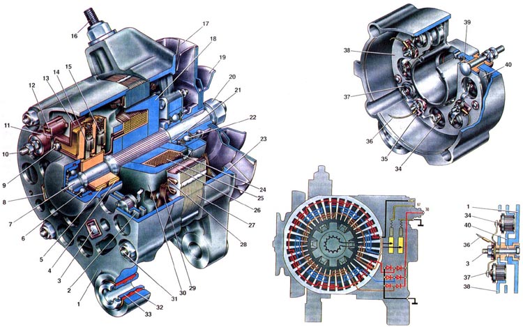 1. Крышка генератора со стороны контактных колец; 2. Выпрямительный блок; 3. Болт крепления выпрямительного блока и фазных выводов обмотки статора; 4. Контактные кольца; 5. Контактные кольца; 6. Шарикоподшипник вала ротора со стороны контактных колец; 7. Вал ротора; 8. Изолирующая втулка; 9. Винт крепления щеткодержателя; 10. Плюсовой клеммовый болт (вывод "30"); 11. Изолирующая втулка контактного болта; 12. Штекер центрального вывода обмотки статора; 13. Щеткодержатель; 14. Отрицательная щетка; 15. Положительная щетка; 16. Шпилька для крепления генератора к натяжной планке; 17. Крыльчатка шкива; 18. Клювообразный полюсный наконечник ротора со стороны привода; 19. Шкив привода генератора; 20. Гайка крепления шкива; 21. Дистанционное кольцо подшипника; 22. Шарикоподшипник вала ротора со стороны привода; 23. Крышка генератора со стороны привода; 24. Каркас обмотки ротора; 25. Обмотка ротора; 26. Изоляция паза статора; 27. Статор; 28. Клин обмотки статора; 29. Обмотка статора; 30. Клювообразный полюсный наконечник ротора со стороны контактных колец; 31. Стяжной болт; 32. Буферная втулка; 33. Втулка; 34. Отрицательный диод; 35. Изолирующая пластина; 36. Провод фазного вывода обмотки статора; 37. Положительный диод; 38. Держатель положительных диодов; 39. Изолирующая втулка; 40. Держатель отрицательных диодов.