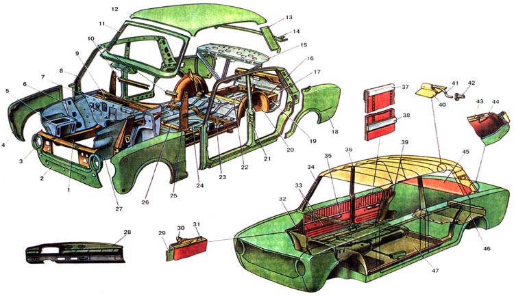 Кузов автомобиля типа "седан", металлический, Цельносварной, несущей конструкции, четырехдверный Петли дверей расположены спереди. Замки дверей и фиксаторы безопасного типа. Окна дверей с двумя стеклами: у передних дверей одно стекло поворотное. Переднее и заднее окна имеют панорамные стекла. Ветровое стекло трехслойное, полированное; заднее - полированное, закаленное. Все стекла безопасного типа. Выступающие части интерьера салона выполнены безопасными (ручки, рычаги, противосолнечные козырьки и другие детали). (наружные поверхности кузова не имеют резких граней и выступов. Для обеспечения безопасности во время движения автомобиля от случайного открывания капот открывается вперед по ходу движения. Наружное и внутреннее зеркала заднего вида обеспечивают водителю хорошую обзорность: внутреннее зеркало снабжено устройством против ослепления водителя от света фар сзади идущего автомобиля. Внутреннее оборудование салона не отвлекает внимание водителя, в поле его зрения отсутствуют блестящие детали, слепящие лампы и блики от контрольных приборов; поворотные мягкие козырьки над ветровым стеклом защищают глаза водителя от слепящих солнечных лучей. Замки дверей выдерживают большие нагрузки и не позволяют дверям открываться самопроизвольно при ударе автомобиля о препятствие. Комфортабельное регулируемое сиденье, хорошая термошумоизоляция кузова, высокоэффективная система отопления, приточная вентиляция салона - все это резко снижает утомляемость водителя. Жесткость кузова подобрана таким образом, чтобы при наезде автомобиля передней или задней частью происходило плавное гашение удара за счет деформации передней и задней частей кузова. Пассажирский салон имеет большую жесткость и не деформируется. Днище кузова и арки колес для защиты от коррозии и шумоизоляции покрыты снизу мастикой толщиной 1-1.5мм. В скрытые полости кузова для дополнительной зашиты от коррозии распылен противокоррозионный защитный невысыхающий смазочный материал НГМ-МЛ или автоконсервант порогов типа "Мовиль". Каркас кузова Все детали и *злы каркаса в основном соединяются между собой контактной точечной сваркой; сильнонагруженные детали дополнительно привариваются дуговой сваркой. Газовой сваркой приваривают панель 12 крыши с боковыми панелями 13. Каркас кузова состоит из следующих основных узлов: передка кузова, пола с усилителями и панелью задка, боковин, задних крыльев, крыши с рамами ветрового и заднего окон, передних крыльев с усилителями. Передок состоит из вертикального щитка 7 передка, коробки 9 воздухопритока, брызговиков передних крыльев со стоиками 6 передней подвески, передних лонжеронов 1, верхней и нижней поперечин передка, кожухов 3 фар, панели 2 передка. К правому брызговику переднего крыла приварена площадка 5 под аккумуляторную батарею. Пол кузова с усилителями и панелью задка включает панели переднего и заднего полов, пола 21 багажного отделения, полов запасного колеса и топливного бака, панели 17 задка. С панелями полов сварены передние и задние лонжероны пола, лонжероны 19 пола багажника, соединители центральных стоек, поперечины 16, 22, 23, 26 кронштейн поперечной штанги, внутренние арки 20 задних колеси другие детали. Боковина 8 состоит из цельноштампованной панели, наружной арки заднего колеса, центральной стойки и усилителе