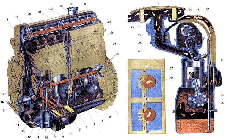 Система смазки двигателя комбинированная: под давлением и разбрызгиванием. Под давлением смазываются коренные и шатунные подшипники, опоры распределительного вала, втулки шестерни и валика привода масляного насоса и распределителя зажигания. Маслом, вытекающим из зазоров и разбрызгиваемым движущимися деталями, смазываются стенки цилиндров, поршни с поршневыми кольцами, поршневые пальцы в бобышках поршня, цепь привода газораспределительного механизма, опоры рычагов привода клапанов, а также стержни клапанов в их направляющих втулках. Вместимость системы смазки 3,75 л. Уровень масла контролируется по меткам на указателе 5. Нормальное давление масла 0,35-0,45 Мпа (3.5-4,5 кгс/см*) при частоте вращения коленчатого вала 5600 об/мин. Минимальное давление должно быть не менее 0,08 МПа (0.8 кгс/см') В систему смазки входят: масляный насос 10, приемный патрубок с фильтрующей сеткой, прикрепленный к корпусу насоса, полнопоточный масляный фильтр 6, установленный на левой передней стороне двигателя; редукционный клапан давления масла, встроенный в приемный патрубок, датчики 29 указателя и контрольной лампы давления масла. Циркуляция масла при работе двигателя происходит следующим образом. Масляный насос 10, приводимый в движение парой шестерен с винтовыми зубьями, засасывает масло из картера через фильтрующую сетку приемного патрубка и подает его по каналу 11 в полнопоточный фильтр 6. Отфильтрованное масло по каналу 12 попадает в продольный магистральный канал 28, проходящий вдоль блока с левой стороны, а оттуда по каналам 16, просверленным в перегородках блока цилиндров, подводится к коренным подшипникам коленчатого вала. К центральной опоре распределительного вала масло подводится по каналам, просверленным в блоке цилиндров 27, в головке цилиндров 26 и в корпусе подшипников распределительного вала. В прокладке головки цилиндров имеется окантованное медью отверстие, по которому масло проходит из канала 27 блока в канал 26 головки. В каждом вкладыше первого, второго, четвертого и пятого коренных подшипников имеется по два отверстия, через которые масло попадает в кольцевые канавки на внутренних поверхностях вкладышей. Из канавок часть масла идет на смазывание коренных подшипников, а другая часть по каналам 2. просверленным в шейках и щеках коленчатого вала, к шатунным подшипникам, и от них через отверстия в нижних головках шатунов струя масла попадает на зеркала цилиндров в момент совпадения отверстия подшипника с каналом в шатунной шейке. С 1990 г. шатуны изготавливаются без отверстия в нижней головке, и масло от нее на стенки цилиндра не подается. Масло, прошедшее к центральной опоре распределительного вала через кольцевую выточку 21 в опорной шейке, попадает в магистральный канал 20 распределительного вала, а из канала через отверстия в кулачках и опорных шейках к рабочим поверхностям кулачков, рычагов и опор вала. Масло от первого подшипника валика 17 привода масляного насоса и распределителя зажигания поступает по каналу, просверленному в самом валике, ко второму подшипнику. К втулке шестерни привода масляного насоса и распределителя зажигания масло подводится по отдельному каналу 13 из полости перед масляным фильтром. Остальные детали смазываются разбрызгиванием и самотеком. Масляный насос (см. рис. 4) - шестеренчатого типа, установлен внутри 