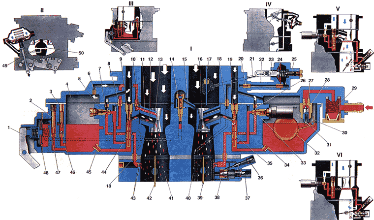 Работа карбюратора при пуске и прогреве холодного двигателя Вследствие низкой температуры деталей двигателя и малой скорости движения воздуха через карбюратор смесеобразование значительно ухудшается. Для надежного пуска двигателя требуется сильное обогащение горючей смеси, которое обеспечивается пусковым устройством карбюратора. При пуске холодного двигателя закрывают воздушную заслонку 17 вытягиванием рукоятки управления на себя до отказа. При этом тяга 21 займет крайнее левое положение а прорези рейки 23, а тяга 4 (см. рис. 8), опускаясь вниз, под действием поворота трехплечего рычага 30 повернет рычаг 6 и приоткроет дроссельную заслонку первой камеры на требуемую величину. При этом на педаль управления дроссельными заслонками нажимать нельзя, чтобы исключить подачу в двигатель избыточного топлива. При прокручивании коленчатого вала двигателя стартером возникающее разрежение передается как к отверстиям автономной системы холостого хода, так и через приоткрытую дроссельную заслонку 39 (см. рис. 9) первой камеры к распылителю главной дозирующей системы. Под действием разрежения топливо начинает интенсивно истекать из отверстий системы холостого хода и распылителя. Из отверстий системы холостого хода топливо поступает в виде топливовоздушной эмульсии. Подмешивание воздуха к топливу происходит через воздушный жиклер 26. Одновременно по каналу связи с задроссельным пространством разрежение передается в рабочую полость диафрагмы 24 пускового устройства, но оно недостаточно для того, чтобы преодолеть сопротивление возвратной пружины диафрагмы. При появлении устойчивых вспышек разрежение возрастает, диафрагма 24 с рейкой 23 втягиваются, и тяга 21 приоткрывает воздушную заслонку 17. При этом рычаг 30 (см. рис. 8), поворачиваясь, сжимает пружину, расположенную в телескопической тяге 24. Пусковое устройство, автоматически открывая или прикрывая воздушную заслонку, не допускает чрезмерного обогащения или обеднения смеси. По мере прогрева двигателя воздушную заслонку полностью открывают, возвращая рукоятку управления пусковым устройством в исходное положение. Крайнее втянутое положение диафрагмы 24 (см. рис. 9) регулируется винтом 25. При полностью вытянутой рукоятке пускового устройства и воздействия на рейку 23 вручную воздушная заслонка должна приоткрываться, и зазор между ее нижней кромкой и стенкой входной горловины должен быть равен 5,0-5,5 мм. При полностью закрытой воздушной заслонке дроссельная заслонка первой камеры должна приоткрываться на 0,70,8 мм. Этот зазор регулируется подгибанием тяги 25 (см. рис. 8). Пусковое устройство карбюратора должно обеспечивать надежный пуск двигателя до температуры минус 25 С без предварительной подготовки двигателя. Работа карбюратора на холостом ходу двигателя Устойчивую работу на холостом ходу обеспечивает автономная система холостого хода. В современных карбюраторах эта система карбюратора также корректирует состав горючей смеси на всех режимах работы двигателя. Дроссельные заслонки на режиме холостого хода прикрыты. При этом переходные отверстия системы находятся чуть выше верхней кромки заслонки. Воздушная заслонка полностью открыта. Разрежение из-под дроссельной заслонки первой камеры через отверстия системы холостого хода передается в каналы системы. Под действием разре