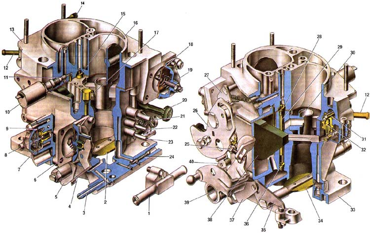 1. Блок подогрева карбюратора; 2. Дроссельная заслонка первой камеры; 3. Патрубок отсоса картерных газов; 4. Рычаг привода ускорительного насоса; 5. Кулачок привода ускорительного насоса: 6. Диафрагма ускорительною насоса; 7. Топливный жиклер экономайзера мощносшых режимов: 8. Корпус карбюратора; 9. Диафрагма экономайзера мощностных режимов; 10. Электромагнитный запорный клапан: 11. Топливный жиклер холостого хода; 12. Патрубок слива топлива в бак; 13. Крышка карбюратора; 14. Патрубок подачи топлю»; 15. Главный воздушный жиклер первой камеры; 16. Воздушная заслонка; 17. Распылители ускорительною насоса; 18. Диафрагма пускового устройства; 19. Регулировочный винт пускового устройства; 20. Регулировочный винт количества смеси холостою хода; 21. Патрубки отбора разрежения н сиоему рециркуляции отработавших газов; 22. Смотри 21; 23. Патрубок обора разрежения к вакуумному регулятору распределителя зажигания: 24. Регулировочный ниш качества смеси холостого хода; 25. Регулировочный винт приоткрывания дроссельной заслонки первой камеры; 26. Рычаг управления воздушной заслонкой; 27. Рычаг воздушной заслонки; 28. Главный воздушный жиклер второй камеры; 29. Эмульсионная трубка; 30. Распылитель главной дозирующей системы второй камеры; 31. Топливный фильтр; 32. Игольчатый клапан поплавковой камеры: 33. Корпус карбюратора: 34. Дроссельная заслонка второй камеры: 35. Рычаг дроссельной заслонки второй камеры; 36. Главный топливный жиклер второй камеры; 37. Рычага привода дроссельной заслонки второй камеры: 38. Поплавок; 39. Рычага привода дроссельных заслонок; 40. Рычаг блокировки второй камеры.