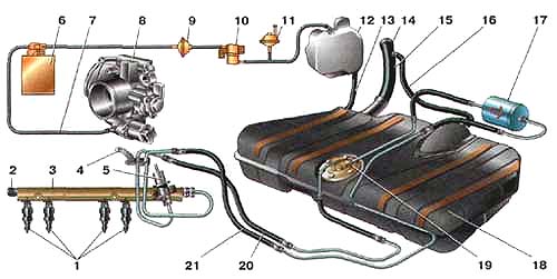 Бензонасос - электрический, погружной, роторный, двухступенчатый, установлен в топливном баке. Развиваемое давление - не менее 3 бар (3 атм). Бензонасос включается по команде контроллера системы впрыска (при включенном зажигании) через реле. Для доступа к насосу под задним сиденьем в днище автомобиля имеется лючок. От насоса по гибкому шлангу топливо под давлением подается к фильтру тонкой очистки и далее - через стальные топливопроводы и резиновые шланги - к топливной рампе. Фильтр тонкой очистки топлива -неразборный, в стальном корпусе, с бумажным фильтрующим элементом. На корпусе фильтра нанесена стрелка, которая должна совпадать с направлением движения топлива.